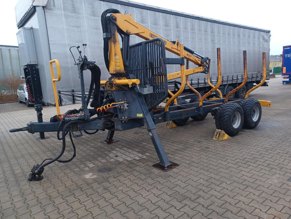 Verkauf im Kundenauftrag. Rückewagen Uniforst Worker 12.48/4667 - Doppelrahmenanhänger - Rahmenverlängerung 70 cm - zul. Gesamtgewicht 12.000 kg - Ladelänge 4.116 mm + 70 cm Ausschub - Ladefläche 2,25 qm - Gesamthöhe mit Kran: 295 cm - hydraulische Knickdeichsel mit 2 Zylindern und 40° Schwenkwinkel - Boogieachsen - Breifung 400/60-15.5 in gutem Zustandca. 80 % - 4 Rungenpaare - Klappbare LED-Beluchtung - geschraubte Zugöse für Obenanhängung - Druckluftbremse auf der 1.Achse - Kran 4667 mit Einfachteleskop - Kranreichweite 6,7 m - Hubmoment 46 kNm - Schwenkbereich 390° - Holzgreifer mit Endlosrotator 4 t - Teleskopstützfüße / A-Abstützung - Weitwinkelgelenk - Drehhebelsteuerung - Stehpodest - Bordhydraulik mit Zapfwellenaufsteckpumpe - Kurbelstützfuß - 25 km/h Zulassung