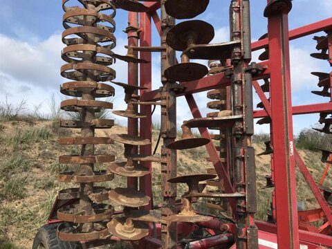 gezogene Scheibenegge, 7, 25 m Arbeitsbreite, hydr. klappbar, Nachläufer: RollFlex Packer, Einzelstützräder, K80 Anhängung, Reparaturbedürftig:Scheiben, div. Lager