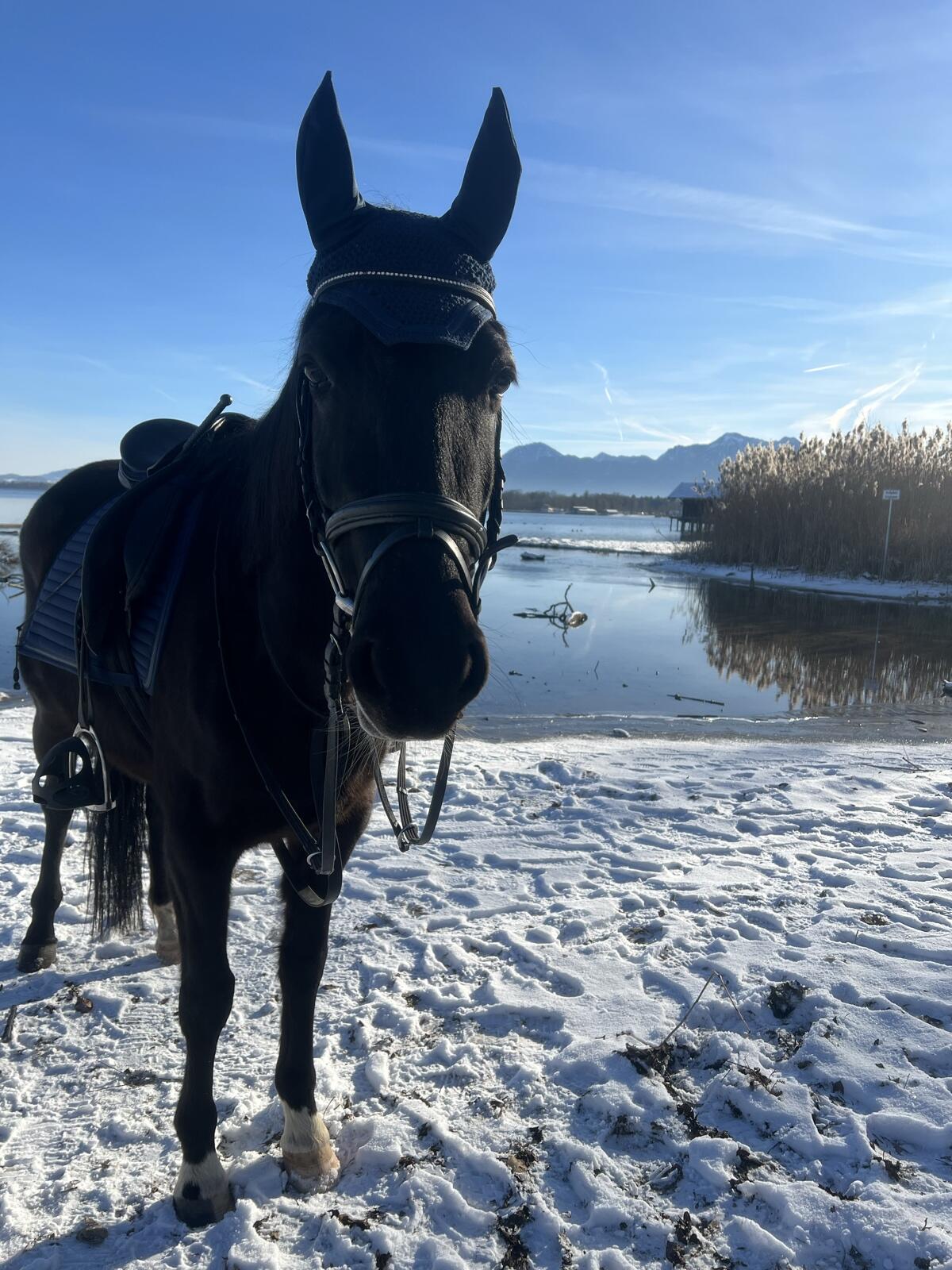 Ruby ist eine 20-jährige bayrische Warmblutstute, Stockmaß ca. 162 cm. Sie lebt bei uns im Offenstall in einer größeren gemischten Herde und ist sehr verträglich mit