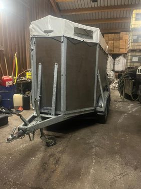 Nr. 88334ViehanhängerTiefladerRäder seitlich der LadeflächeAufbau mit Phenolholzplatten 1500 mm hoch Anhänger mit Planengestell seitlich rechts vorne A