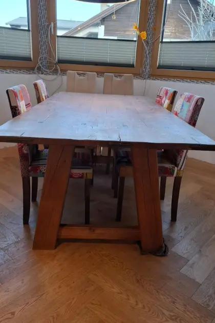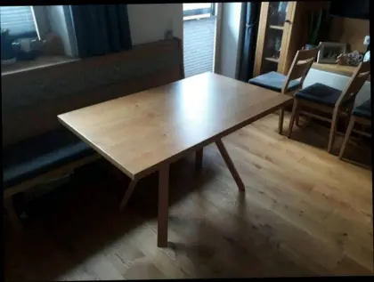 Verkaufe meinen Esstisch (2 m x 1 m), Bank (45 cm x 2 m) in Eiche massiv, 4 cm, neuwertig, wurde nie verwendet, bei Fragen einfach schreiben oder bitte melden. Tagli