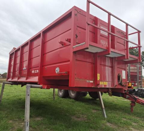 Hackschnitzel-Anhänger mit Kratzboden und Auswurfwalzen, ca. 18 m³, Einleiter-Druckluftbremse, Antriebsketten teilweise erneuert, Kratzbodengeschwindigkeit regelbar,
