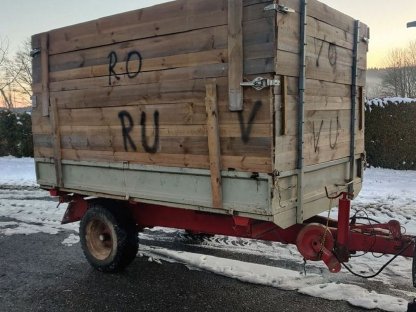 Großer Ballenwagen samt Druckluftbremse und niedriger Plateauhöhe sowie vorne und hinten mit Rungen ausgestattet. Für Rundballen, Quaderballen, Kisten, Paletten, Pla