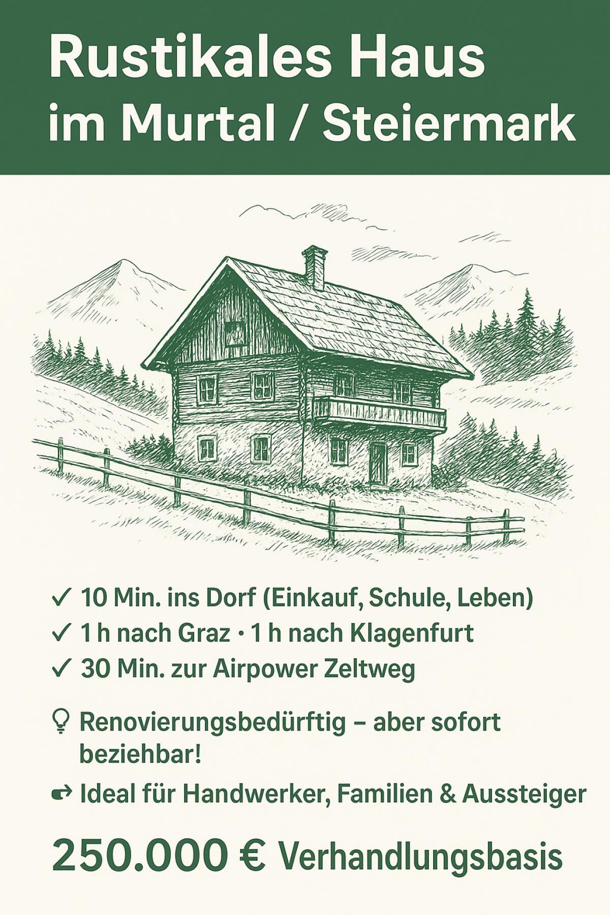 Rustikales, renovierungsbedürftiges Landhaus auf dem Berg im Murtal/Lavanttal mit Einliegerwohnung und großem Garten. Dieses charmante Zuhause liegt ruhig und sonnig, umgeben von Natur und herrlicher Aussicht – ideal für Handwerker:innen, Familien oder Aussteiger:innen. Hauptwohneinheit mit zwei Schlafzimmern, gemütlicher Stube, Küche, Wohnzimmer mit Balkon, Bad, Wäschezimmer und Keller. Zusätzlich kleine Wohnung ca. 40 m². 700 m² Garten zum Entspannen oder Gärtnern. Bezug nach Absprache, Preis VB € 250.000,-.