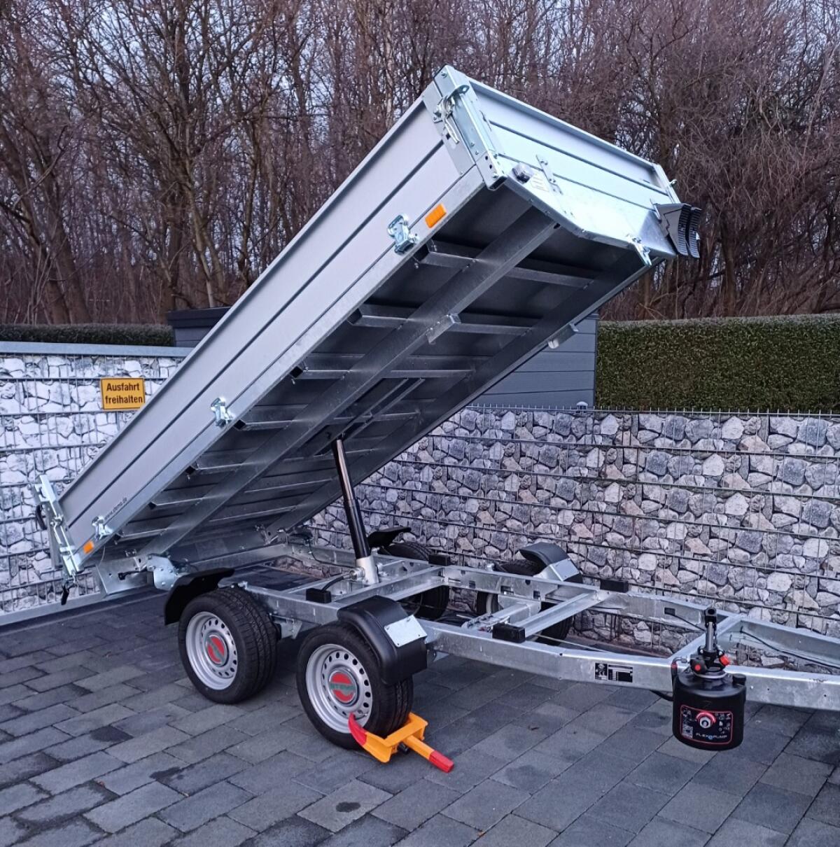 STEMA Rückwärtskipper ROCKO Smart RKE 02 27-30-15.2 – 2,7 t, Profiqualität. Zulassungsfähig Tempo 100 km/h. Robuster STEMA Rückwärtskipper mit FLEX-e-Pump-hydraulik, entwickelt für Schüttgüter, Maschinen, Baumaterial und Garten- & Landschaftsbau. Nutzmaß (L × B): 301 × 153 cm, Außenmaß (L × B × H): 435 × 170 × 119 cm, Bordwandhöhe: 30 cm, Ladehöhe: 72 cm. Nutzlast: 2.035 kg, zulässiges Gesamtgewicht: 2.700 kg. Technische Ausstattung: Rückwärtskipper (Hochlader), Handhydraulik mit 3-stufigem Teleskopzylinder, zusätzliche Oxinit-Beschichtung (besonders langlebig), Kippwinkel: 46°, gebremst, Stützrad inkl., 13-poliger Stecker (EG-Ausstattung). Verzurrmöglichkeiten: 8 versenkte Zurrbügel.