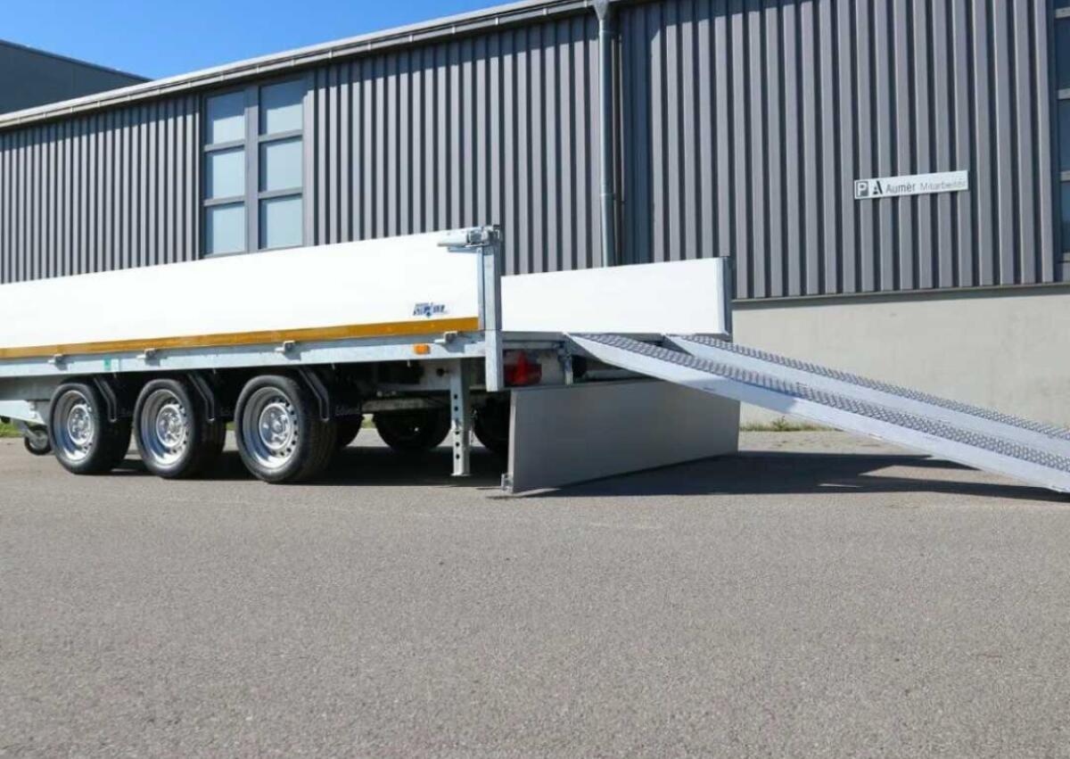 Vermiete Pkw Hochlader Tridem 3.500 kg, L=4 m, B=2 m. Bordwand H=30 cm, Höhe vom Boden auf OK Plateu 63 cm. Nutzlast: 2.700 kg, inkl. Rampen.