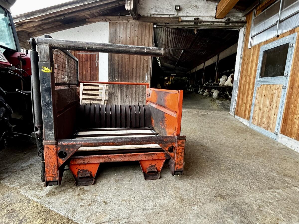 Auer Rundballenabwickler mit hydr. Ladearm in technisch einwandfreiem Zustand. Kratzbodenkette, Kettennüsse, Führungsschienen und Holzboden erneuert. Aufnahme mit Staplergabel von 3 Seiten möglich.