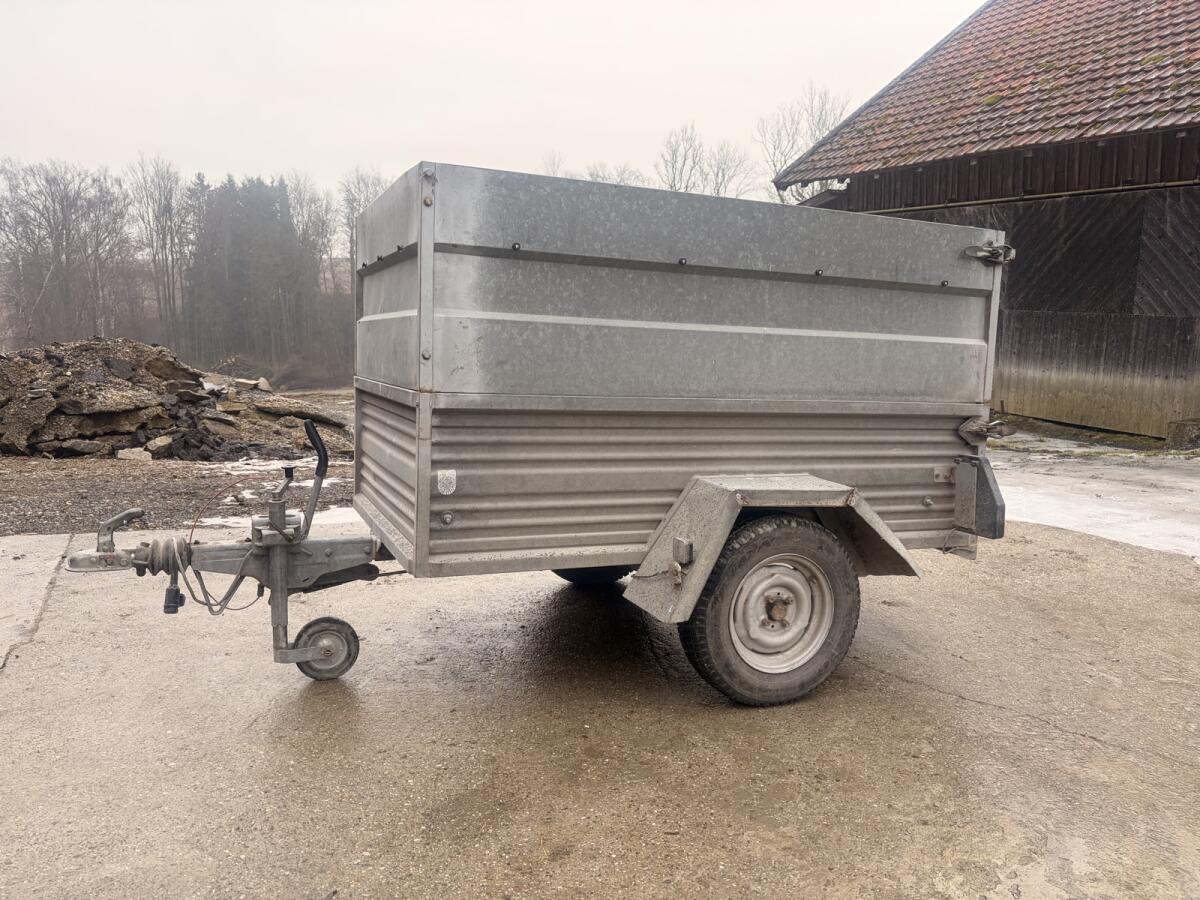Leichter Anhänger 750 kg Ges. Gew., Kastenmaß 1,9 m x 1,1 m, Bordwände gesteckt, Blechdach zum Aufstecken, Auflaufvorrichtung vor einigen Jahren erneuert, Reifen neuwertig, Pickerl aktuell nicht gültig, kann aber ohne Probleme gemacht werden.