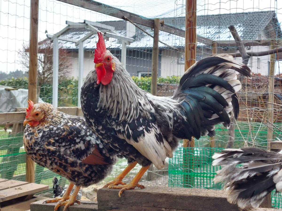Unsere bunten Bayerischen Landzwerghähne suchen dringend und schnell ein neues Zuhause. Sie sind alle freundlich und relativ zahm. Sie sind sowohl für die Zucht als auch für die Haltung als Hahn in einer bunten Hühnerschar geeignet. Man kann sie problemlos mit allen verschiedenen Hühnerrassen zusammenhalten. Auch mehrere Hähne zusammen verstehen sich super. Da es Bayerische Landzwerghähne sind, liegt ihr Gewicht bei ca. 1 kg. Sie sind sehr, sehr gute Futtersucher und sitzen gerne auf erhöhten Ästen und anderen Strukturen. Sie warnen ihre Hühnerschar stets vor Gefahren, egal ob vom Habicht in der Luft oder von der Katze am Boden.
