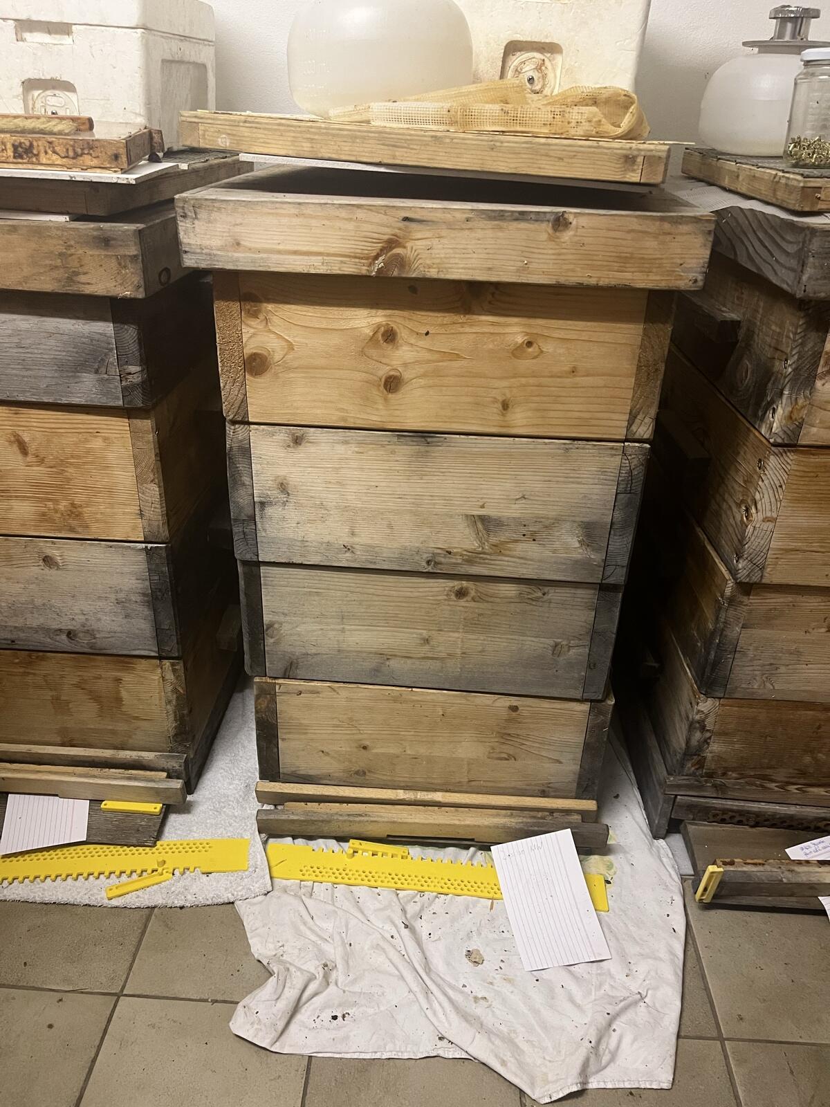 Ich muss leider mit der Imkerei aufhören, habe einige Zanderbeuten mit Zubehör abzugeben. Mit Futterzarge, Futtergeschirr. Teils neu eingelötet. Honigraum bei einigen Beuten sauber ausgebaut. Gereinigt und in sauberen Zustand. Ich schenke einiges dazu, je Beute vier bis fünf Dinge, Draht, Besen, Zuchtkästchen, Liebigdispenser.