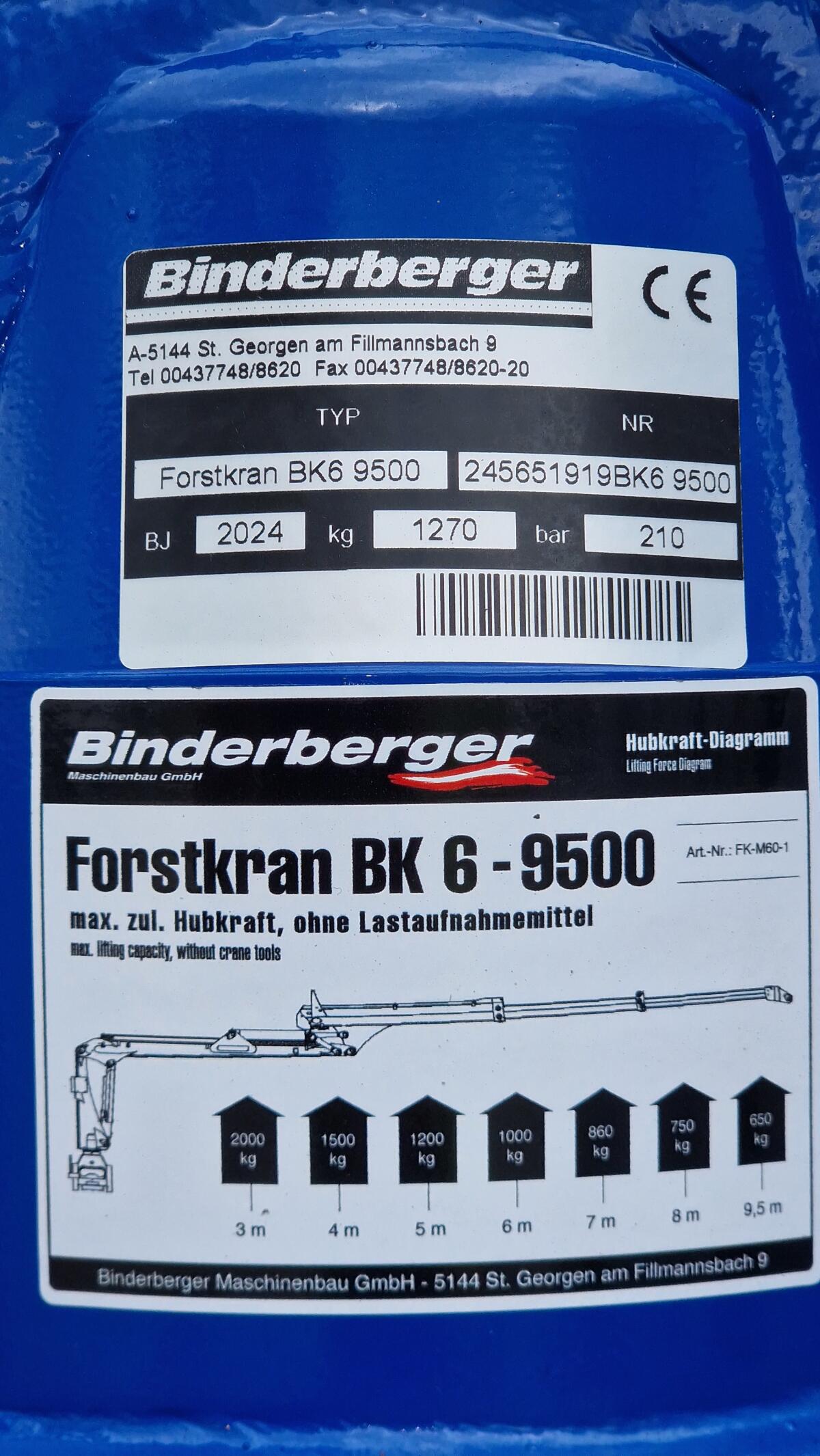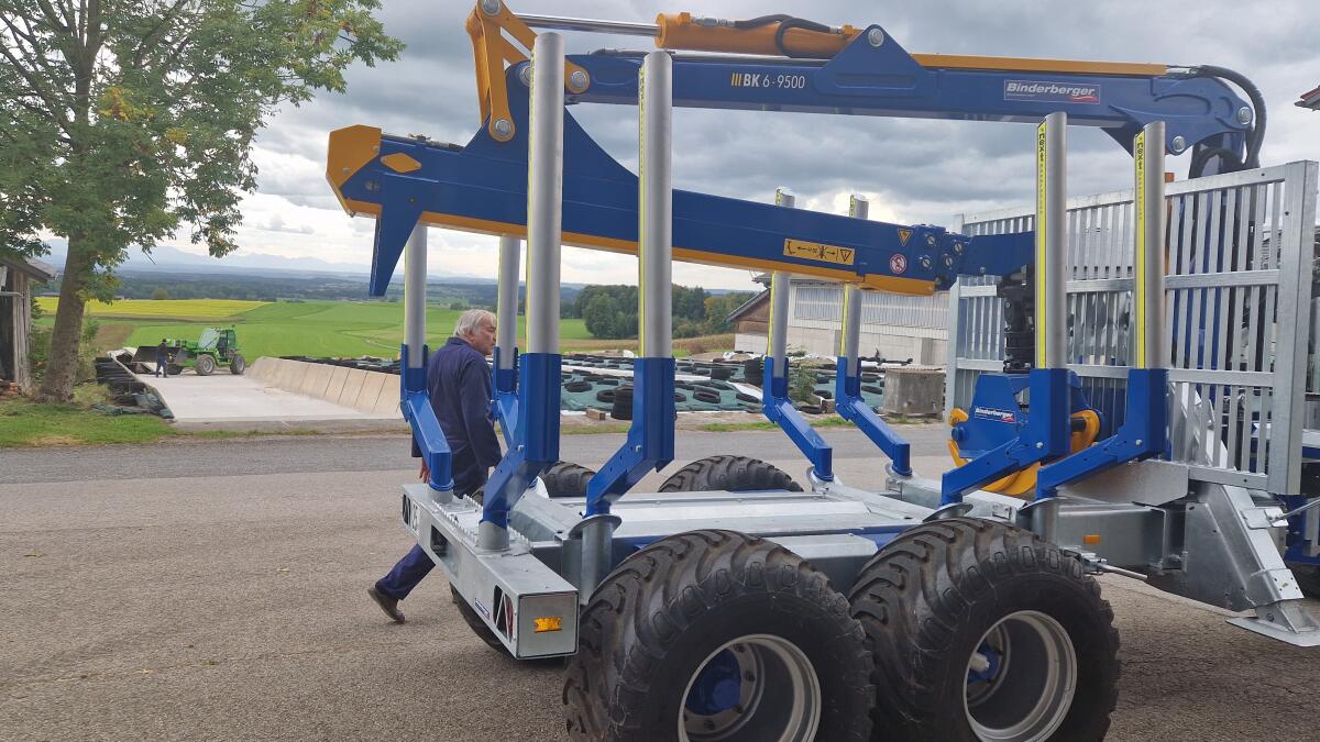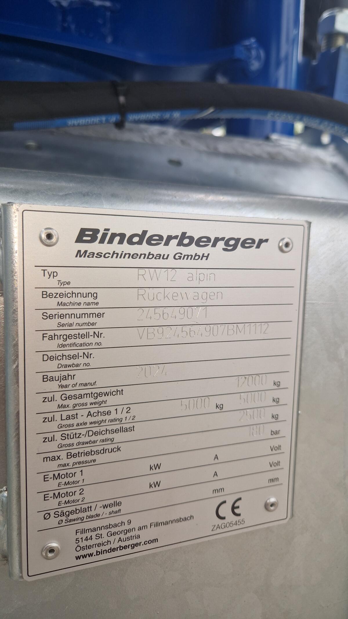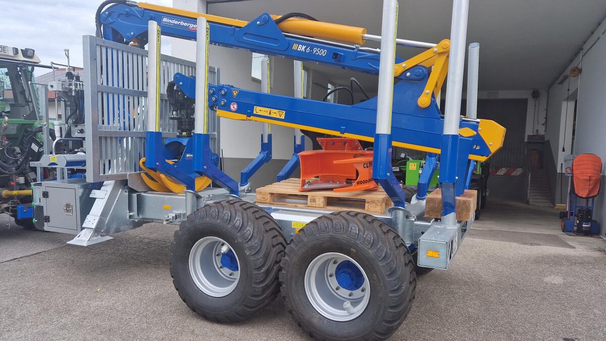 Binderberger Rückewagen RW 12, BK 6 - 9.500, A-Abstützung 3,30 m, Druckluftanlage, Bereifung 500/50-17, Telematic, Werkzeugkiste und 2 Motorsägenhalterungen, TÜV 25 km/h mit Kranbuch, Eigenölversorgung 2 Kreis, 5,5 t Rotator und Reisiggreifer 1.400, Kranablage, eingebauter LED Arbeitsscheinwerfer, Rungendeckel.