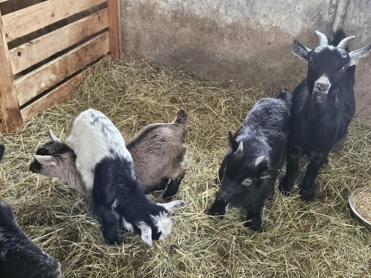 Wegen Bestandsauflösung verkaufen wir unsere 5 Minizwergziegen, toll wäre es, wenn sie zusammenbleiben könnten. Es sind zwei Ziegen mit ihren Kitz. Gerti, geboren am 11.04.2024 (größere Schwarze) mit ihren Zwillingsböcken Oskar und Leo (schwarz/weiß und braun), geboren am 17.01.2026. Lotti, geboren am 22.02.2025 (kleinere Schwarze) mit ihrem Bock Adam, geboren am 25.12.2025. Die Ziegen werden derzeit zusammen gehalten, sind sehr zutraulich und haben 24h Freilauf. Wir würden uns sehr freuen, wenn wenigstens die Ziegen mit ihren Kitz zusammenbleiben könnten. Der Preis bezieht sich auf eine Ziege. Wir freuen uns auf Eure Kontaktaufnahme.