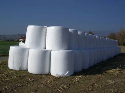 BIO-Luzerne-Rotklee-Silage vom 1. und 2. Schnitt gemischt, Ballendurchmesser ca. 1,35 m, ca. 50 Ballen.