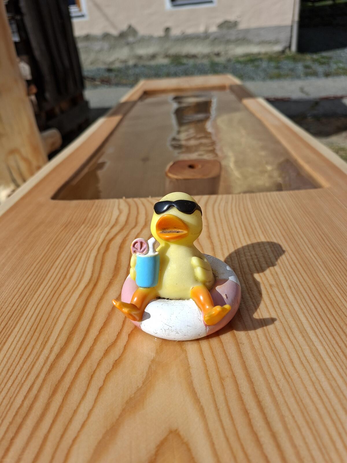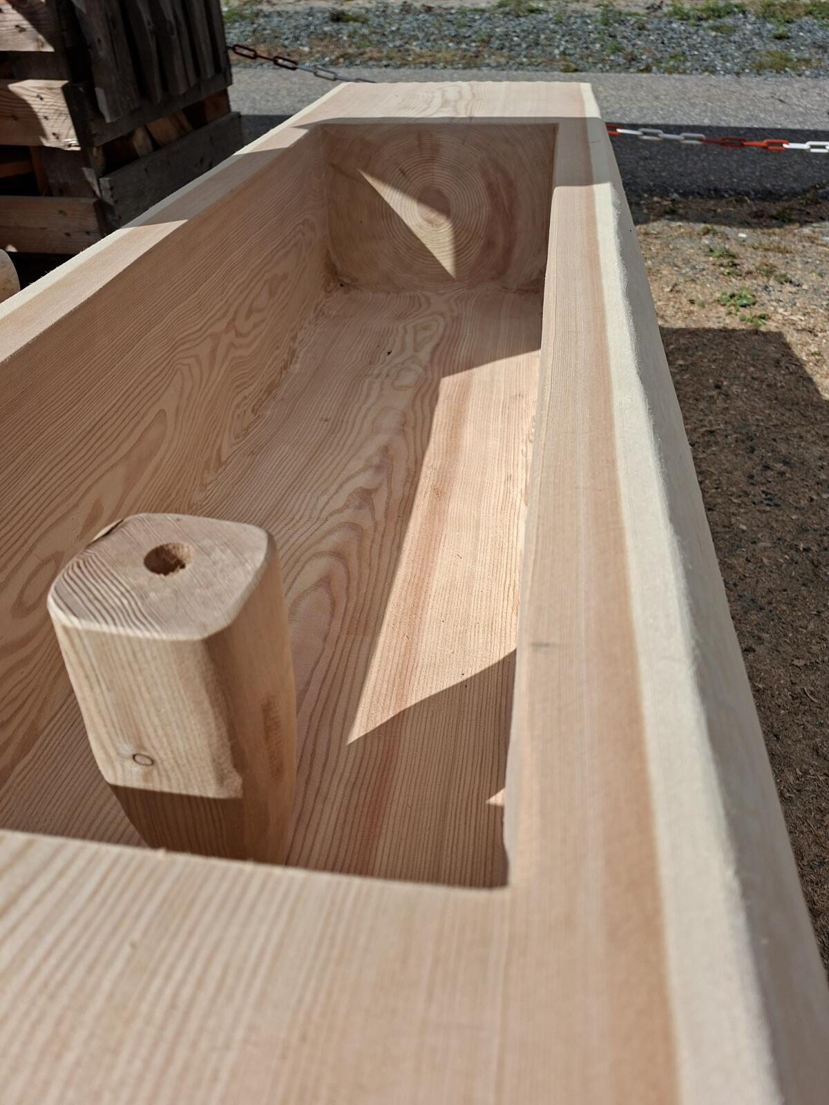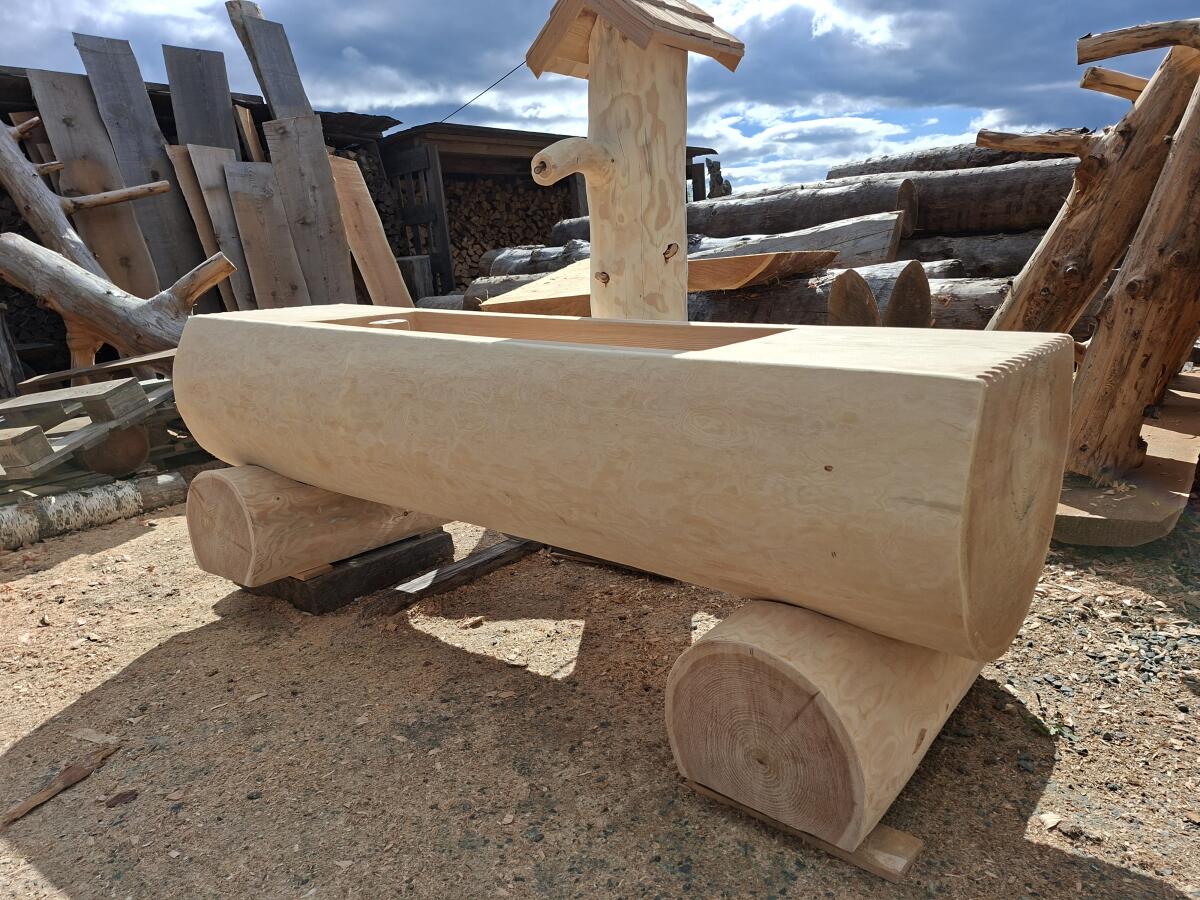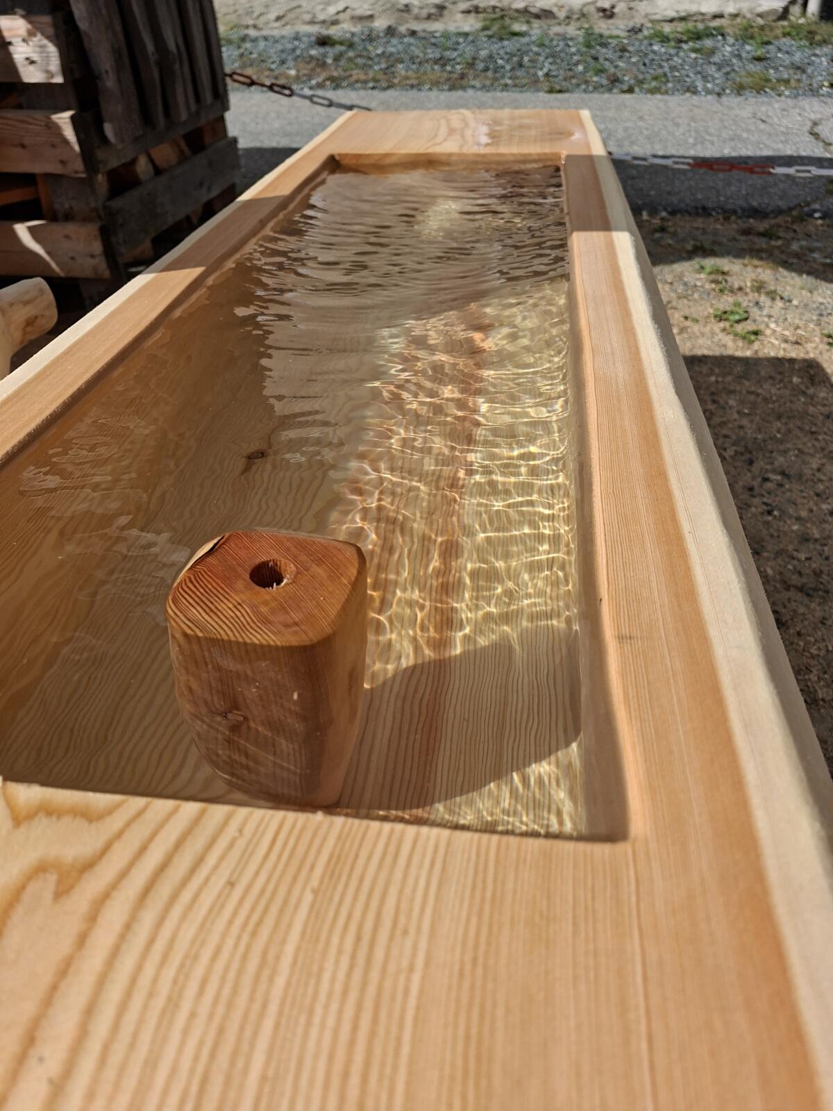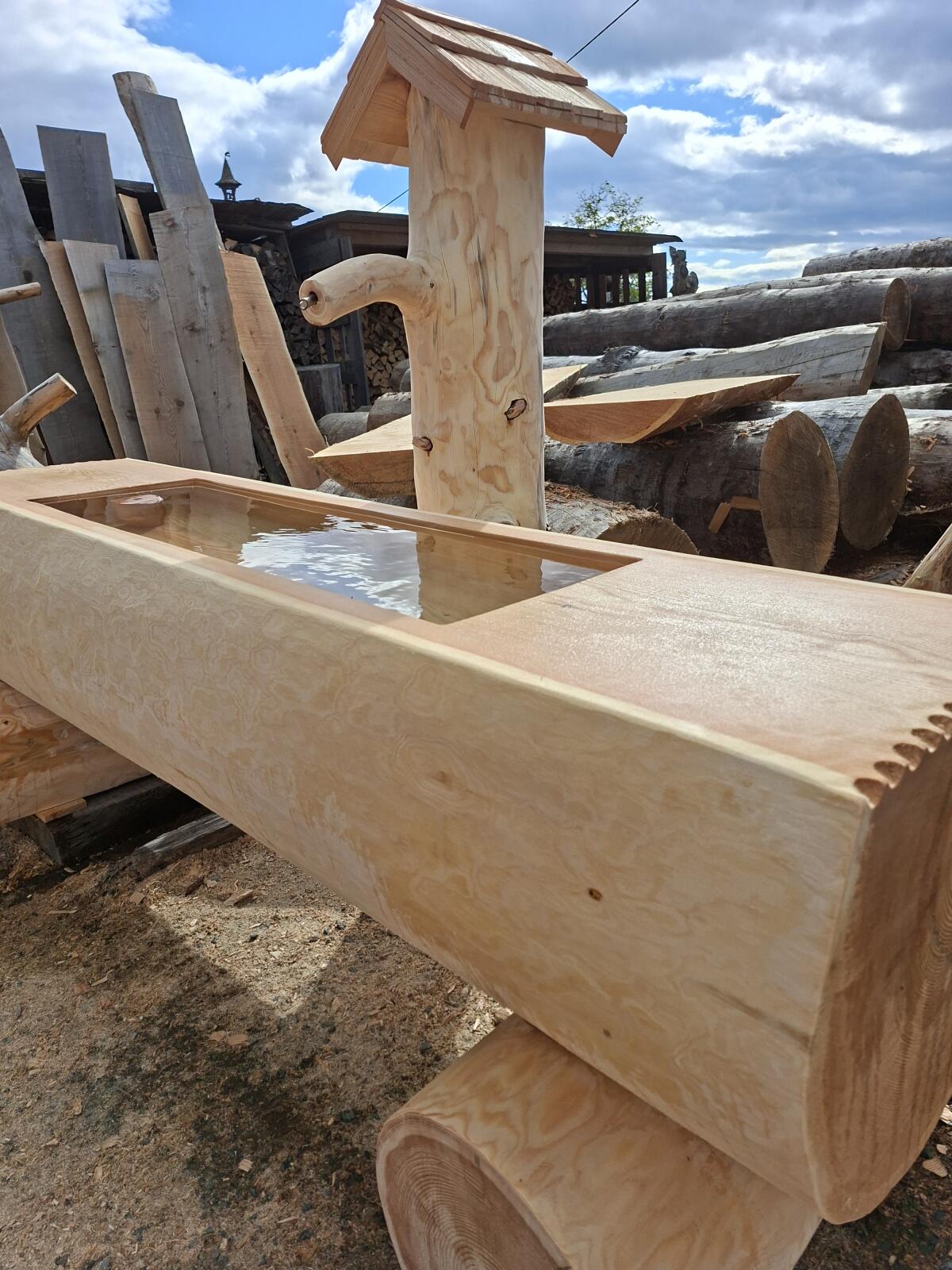 Regionale Kärntner Gebirgslärche. Länge Trog 181 cm, Wassermaß L 100 B 31 T 22 cm, Stammdurchmesser 53 cm. Wassersäule mit handgemachtem Lärchenschindeldach. Platz für 2 Kisten Bier. Zustellung nach Entfernung gegen Aufpreis möglich.