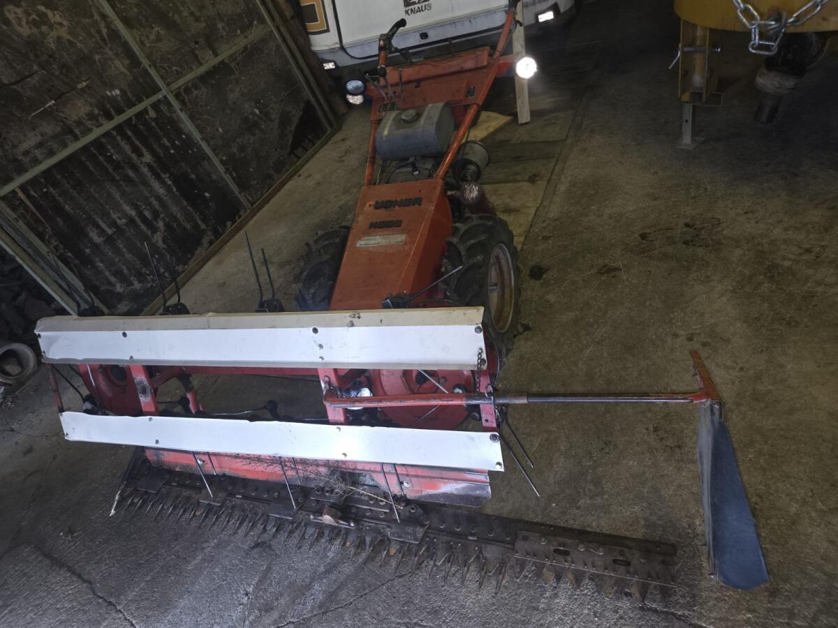 Bucher M500, Eingraser Motormäher, 11 PS MAG Motor, 190 cm Fingermähbalken, Rechenaufsatz, 3 Vorwärts- und 2 Rückwärtsgänge, Zusatzgewicht für leichtere Aushebung, Gitterräder.