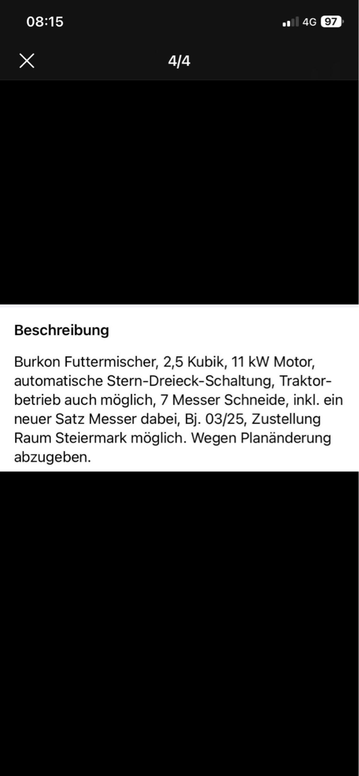Burkon Futtermischer, 2,5 Kubik, 11 kW Motor, automatische Stern-Dreieck-Schaltung, Traktorbetrieb auch möglich, 7 Messer Schneide, inkl. ein neuer Satz Messer dabei, Bj. 03/25, Zustellung Raum Steiermark möglich. Wegen Planänderung abzugeben.
