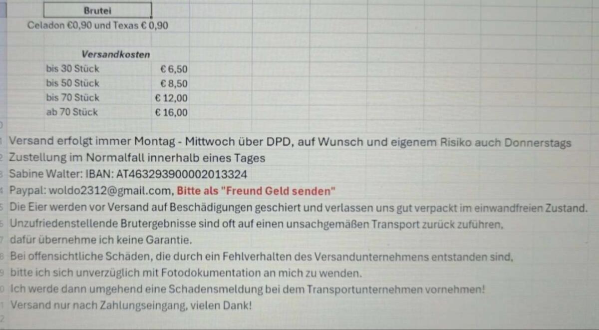 Verkaufe Celadon und Texas Mastwachteln Bruteier. Preis pro Stk. € 0,90. Versand bis 30 Stk. € 6,50, bis 50 Stk. € 8,50, bis 70 Stk. € 12,- und ab 70 Stk. € 16,-. Info bzgl. Versandkosten siehe Bild 3.