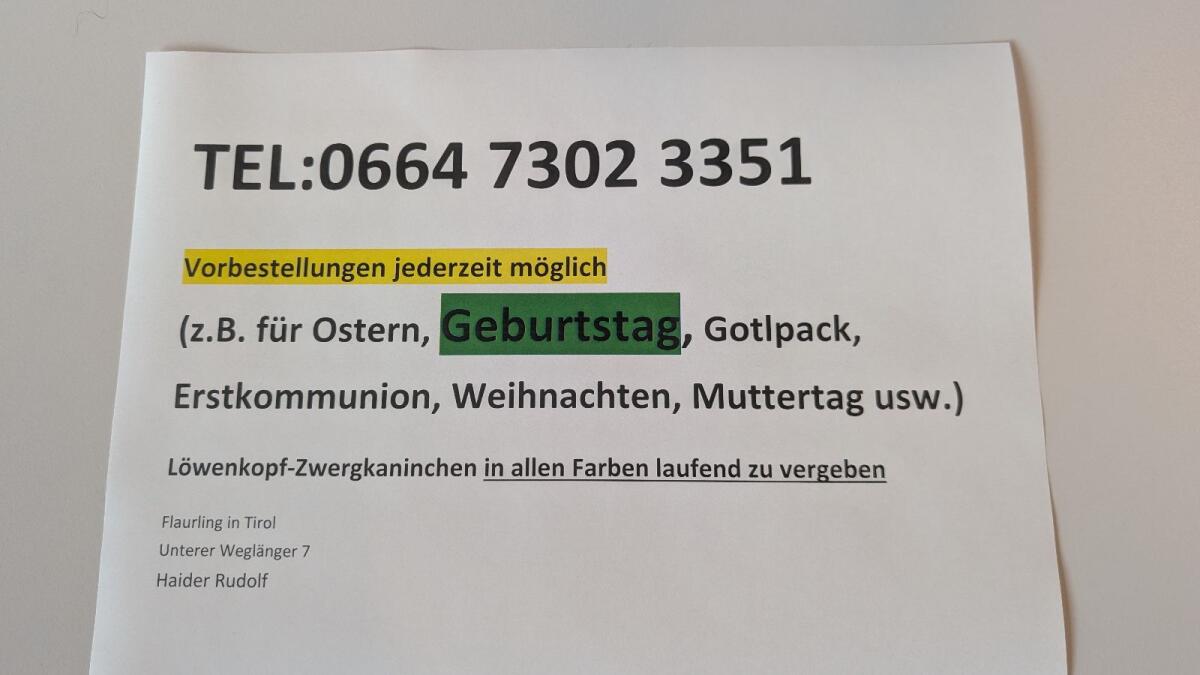 Flaurling in Tirol. Einige sehr schöne Zwergkaninchen in allen Farben zu verkaufen. Die sehr zahmen Kaninchen sind für Kinder super geeignet. Auch Vorbestellungen jederzeit möglich. Diese und noch einige mehr habe ich derzeit zu vergeben.