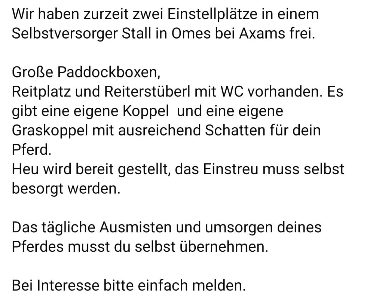 Wir haben zurzeit Einstellplätze in unserem Selbstversorgerstall in Omes bei Axams frei. Große Paddockboxen (12 m² Box mit 12 m² Paddock), Reitplatz (20x40) und Reiterstüberl mit WC vorhanden, es gibt eine eigene Koppel und eine eigene Graskoppel mit ausreichend Schatten für dein Pferd, Heu wird bereitgestellt, das Einstreu muss selbst besorgt werden. Das tägliche Ausmisten und Umsorgen deines Pferdes musst du selbst übernehmen. Waschplatz, Strohraum, tolles Ausreitgelände. Bei Interesse bitte einfach melden.