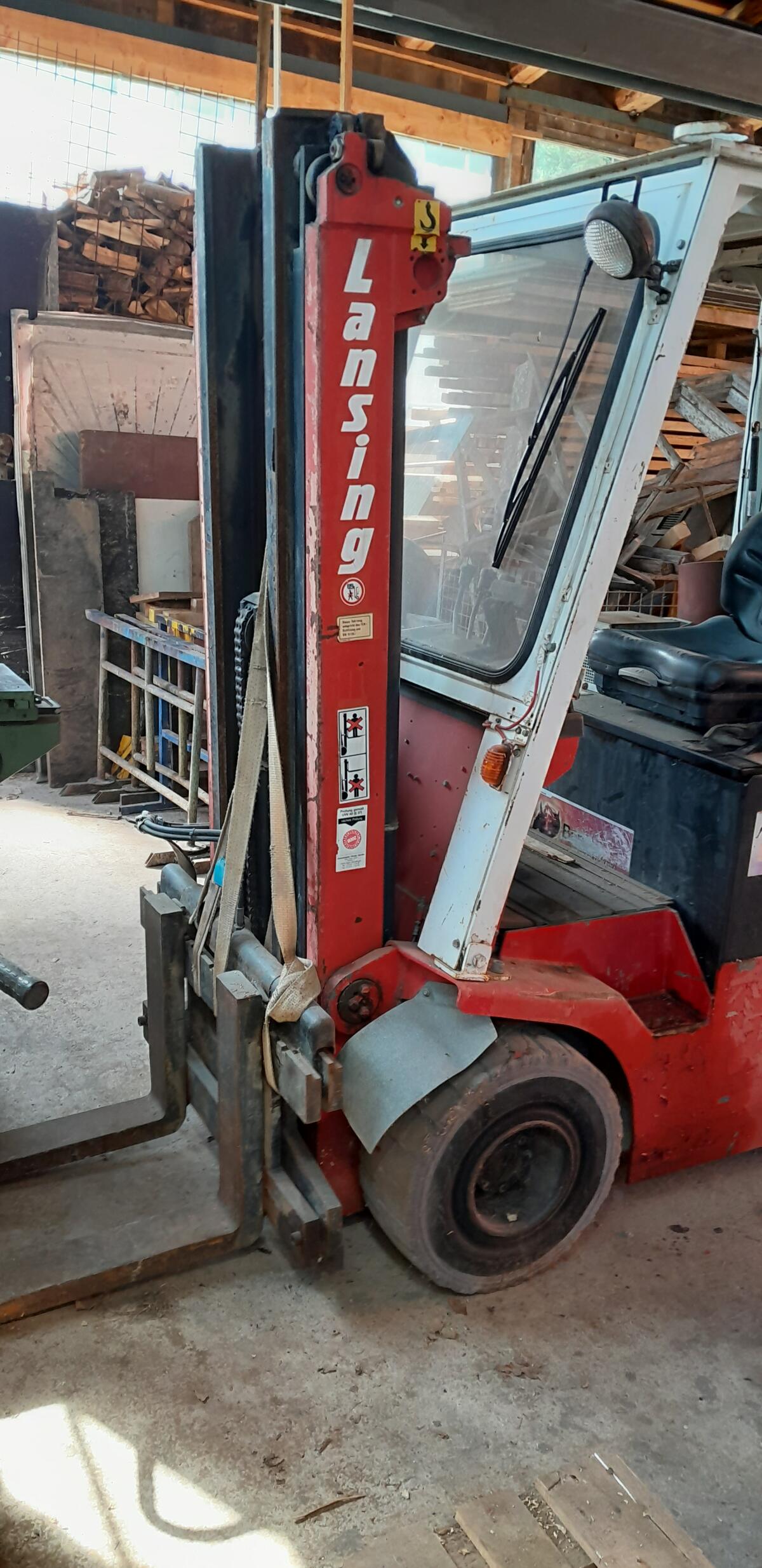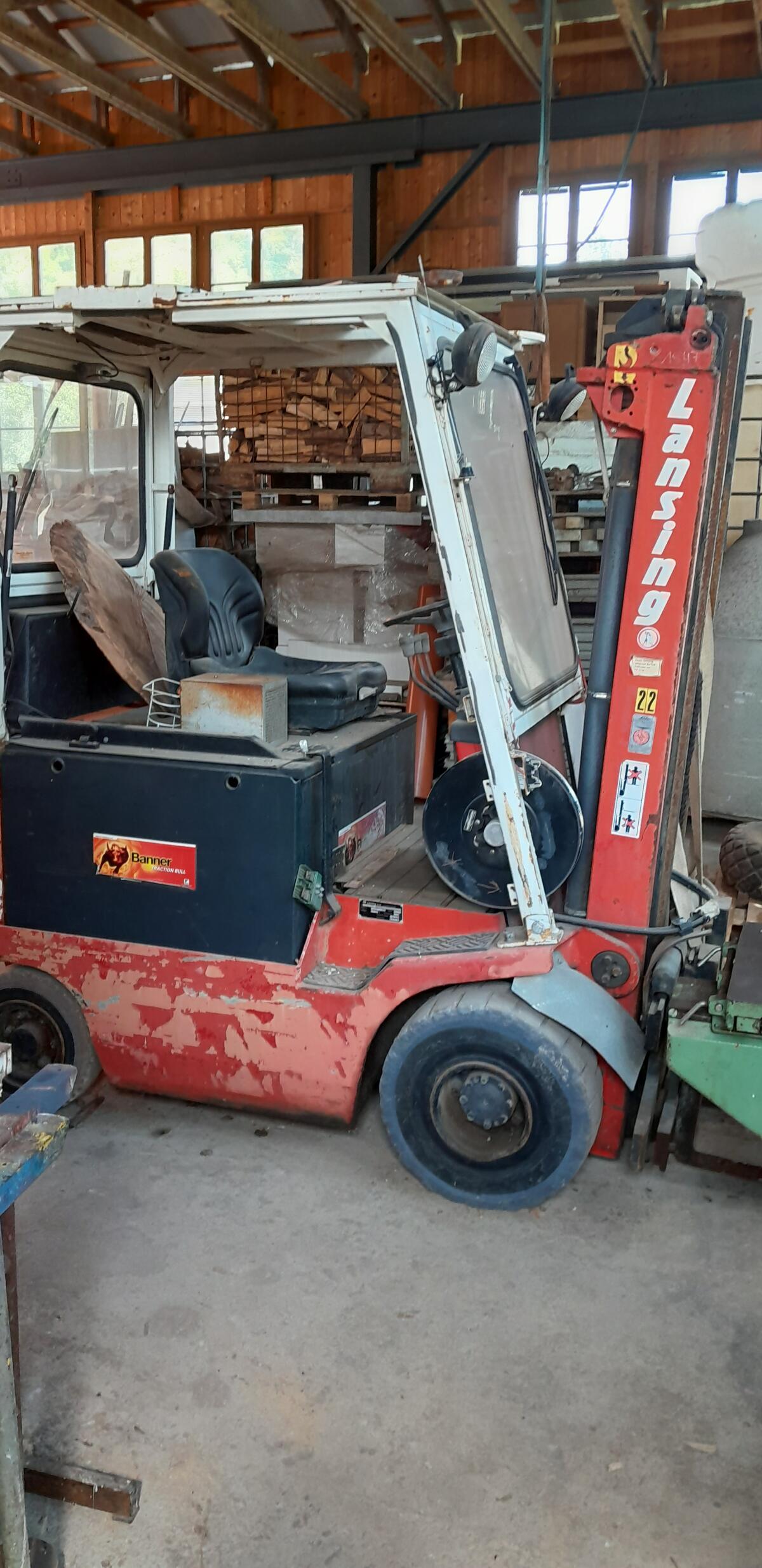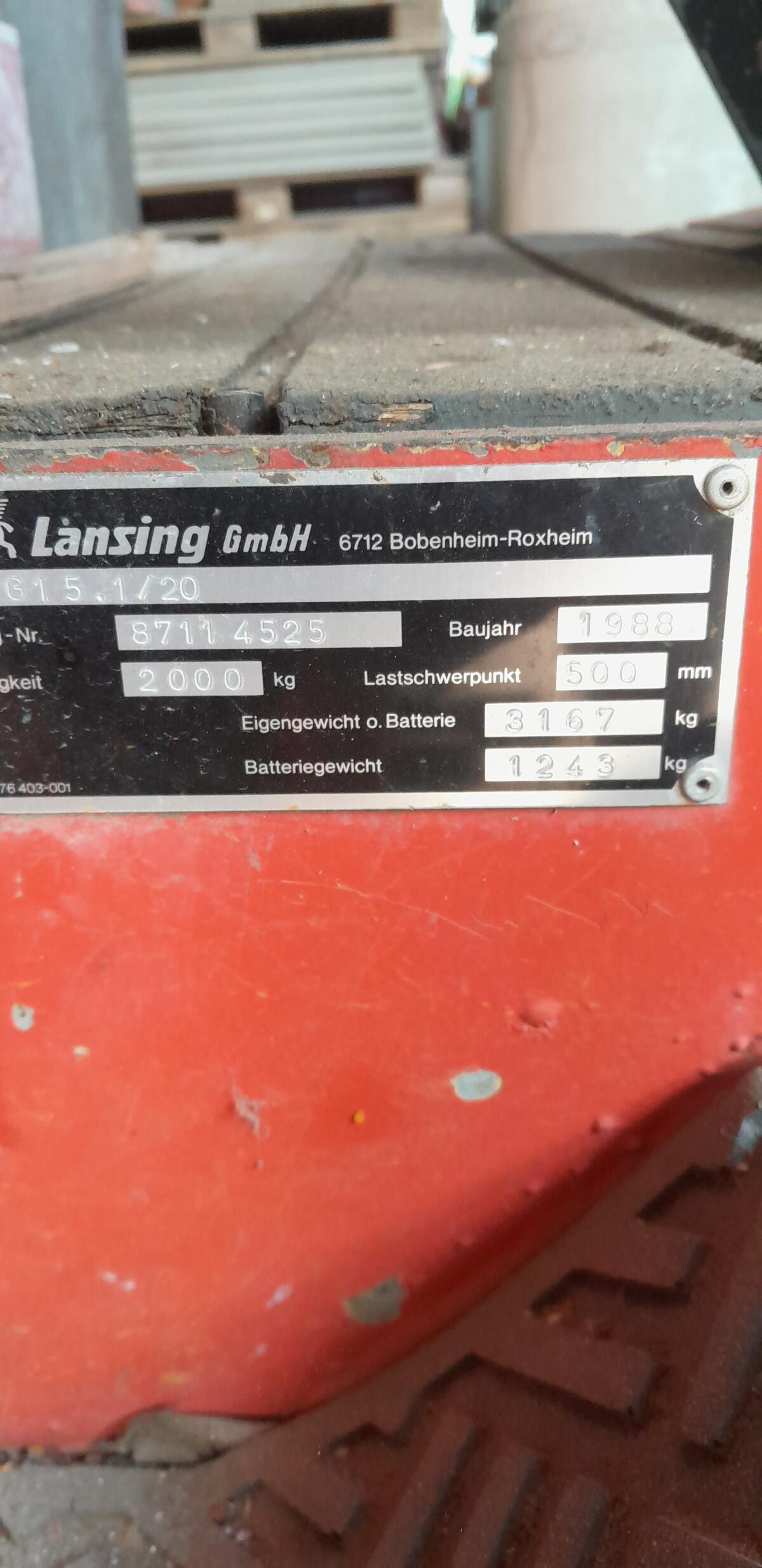 Elektro Stapler Lansing, Bj. 1988. Betriebsstunden: 7.881h. Tragfähigkeit: 2.000 kg bei 500 mm Lastschwerpunkt. Eigengewicht ohne Batterie: 3.167 kg, Batteriegewicht: 1.234 kg.