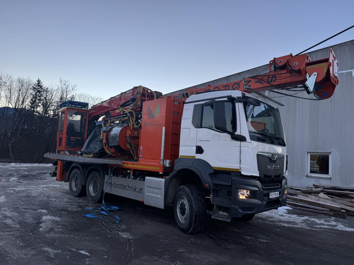 Aus gesundheitlichen Gründen muss der 2024er Syncrofalke schweren Herzens verkauft werden. Bj.: 05/2024, ca. 1.495 Bstd., 700 m (20 mm) Tragseil (Seiltrommel für 800 m ausgelegt), 1.600 m (11 mm) Zugseil (für 1.800 m ausgelegt), 1.600 m (8 mm) Hilfseil (für 1.800 m ausgelegt), MAN TGS 6x6 (470 PS), Palfinger Epsilon Kran (S280L94), Woody WH60-1 + Ersatzteilpaket (2024), MM Sherpa U 3 t (2024), TOP Zustand, neuwertig, weitere Details auf Anfrage.