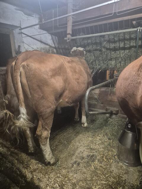 Fleckviehkalbin trächtig aus Zuchtbetrieb abzugeben, Kalbedatum 16.12.2025, Mutterleistung 10.000 kg.