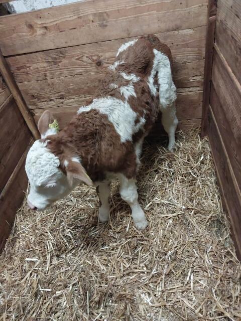 Ich verkaufe unser genetisch hornloses Fleckviehzuchtkalb Selly, geb. 06.10.2025, Vater: Walkner PP*, Einsatzleistung: 43,00 kg, Fett: 5,23 %, Eiweiß: 3,30 %, Zellzahl 26.