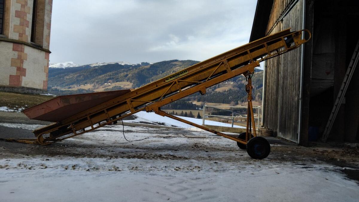 Verkaufe ein Förderband der Marke Kropath. Länge 5,2 m, Höhe verstellbar 2,3 bis ca. 3,4 m, Breite Förderband 40 cm, Breite Aufgabe Trichter 2 m. Funktioniert einwandfrei für Stückgut und alle Schüttgüter wie Hackschnitzel. Kipper kann auch längs abladen dank dem Aufgabe Trichter. Inkl. abnehmbarem Fahrwerk und Zugdeichsel.