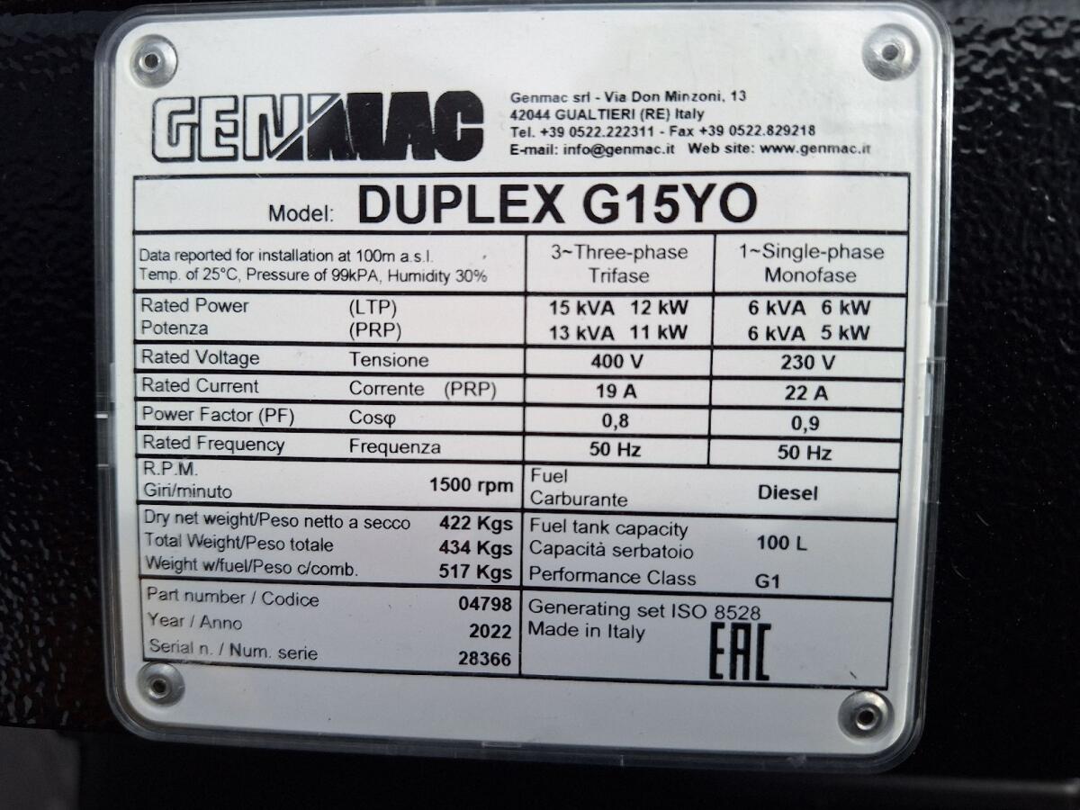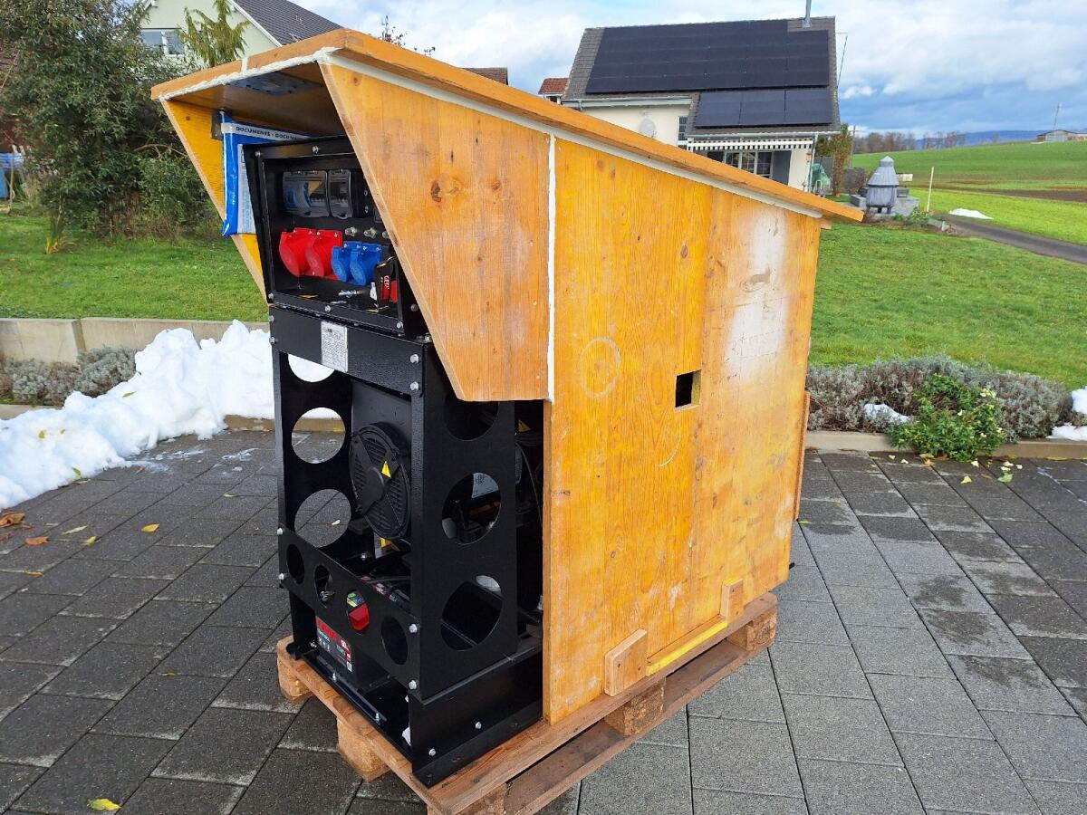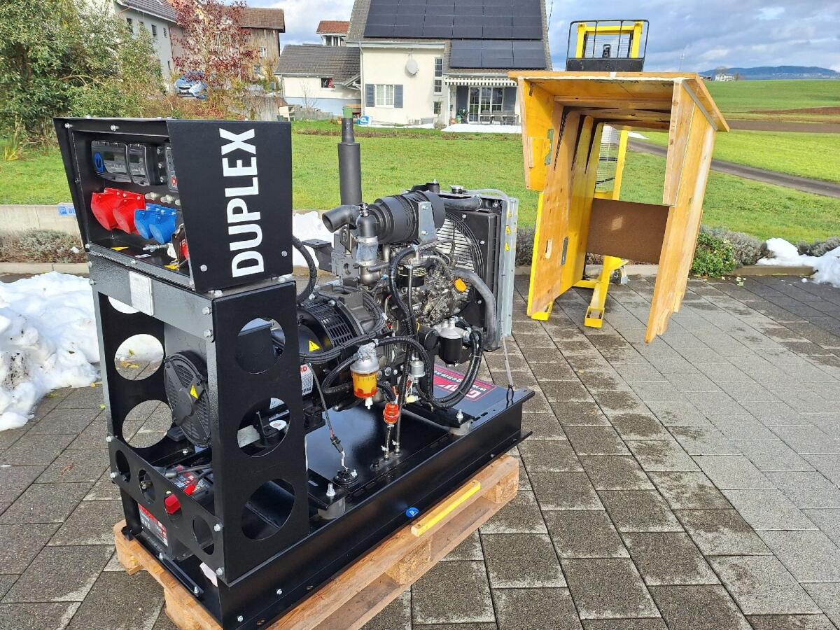 Generator 15 kW 3 Zyl. Yanmar Motor, 100 l Diesel Tank, Stamford Stromerzeuger Duplex neuwertig. Bj. 22, seither nur ca. 5 Probeläufe. Verschalung Marke Eigenbau aus massiven Schalplatten, verleimt und verschraubt, wasserdicht, mit Stapler werkzeuglos abheben, inkl. 25 m 380er Kabel mit passendem Stecker. Sehen Sie Originalrechnung (ohne Verschalung) auf Bildern. Maschine im neuwertigen Zustand.