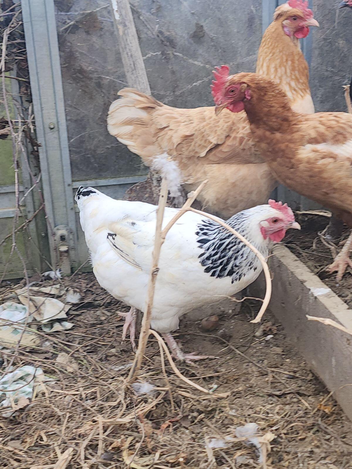 Verschenken drei Hennen, ungefähr zwei Jahre alt. Vielleicht ein bisschen Trinkgeld für das Fangen und die Schachtel. Zwei braune und eine weiß-schwarz.