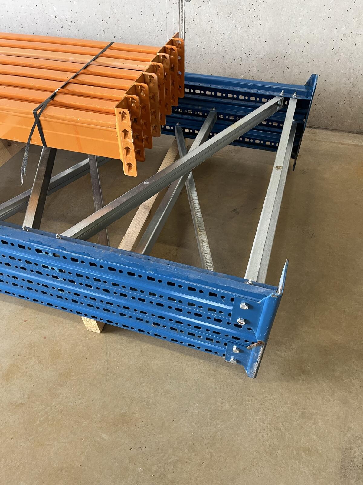 Verkaufe gebrauchtes Hochregal der Marke Nedcon. 3 Steher mit einer Breite von 1,1 m und 3,5 m hoch, 8 Traversen mit einer Länge von 2,7 m.
