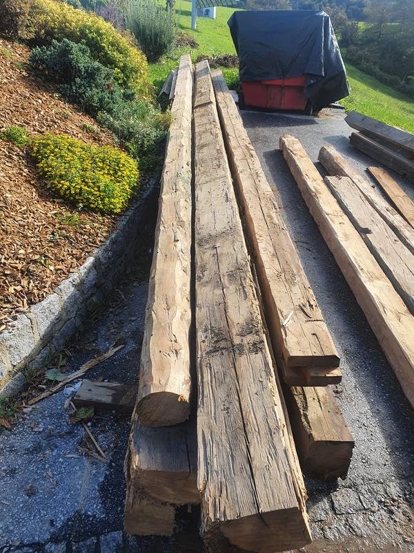 Holzbalken, gehackt, vermutlich von 1960, im Trockenen gelagert, Fotos vorhanden. Preis VB, Einzel- und Mehrfachabnahme möglich. Verschiedene Maße vorhanden, Durchschnittsmaß: Länge 8,35 m und 23 x 18 cm.