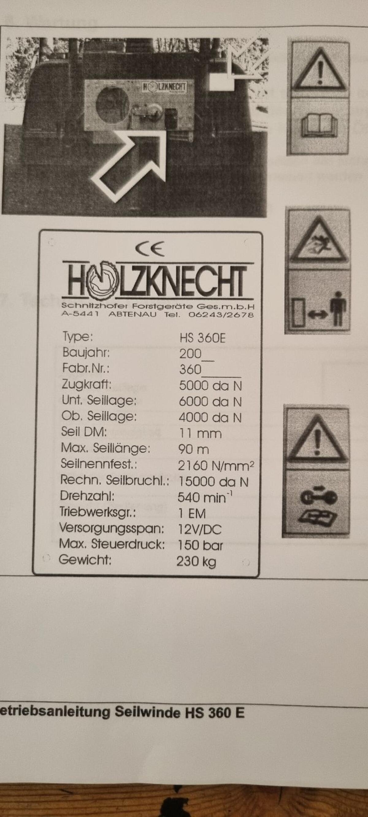 Verkaufe gebrauchte Holzknecht Seilwinde inkl. Gelenkwelle. Zustand: Sehr gut, technisch einwandfrei. Einziger Mangel: Leichte Beschädigung am 12V-Spannungsversorgungskabel (funktioniert aber trotzdem problemlos). Eingesetzt wurde die Winde ausschließlich zur Holzbringung im Eigenwald mit einem 70 PS Traktor. Seillänge: 80 m, Stahlseil in gutem Zustand. Winde ist sofort einsatzbereit. Keine Gewährleistung, da Privatverkauf.