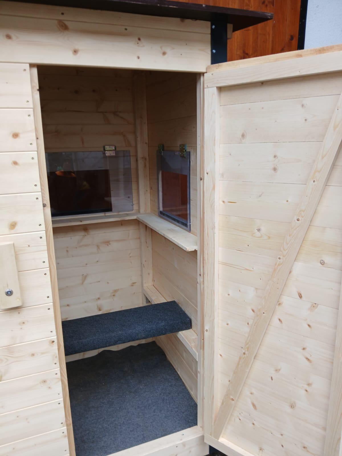 1,2 m mal 1 m mal 2 m, 3 Fenster mit 5 mm Plexiglas, Sitzbank gepolstert, Boden Teppich Dach 19 mm hochwertige Siebdruckplatte Wände 19 mm, Nut Feder Fichte gehobelt.