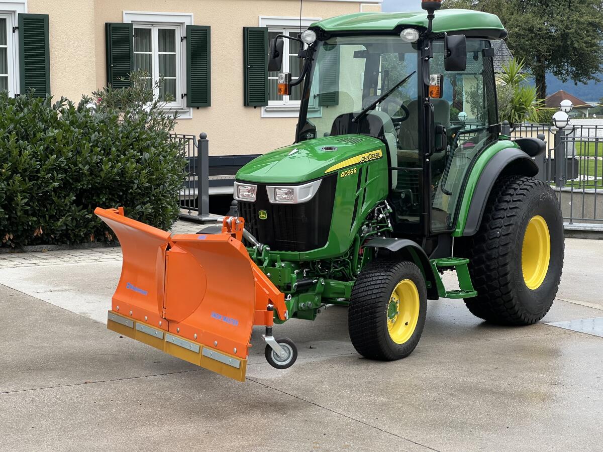 John Deere 4066R Kommunaltraktor, EZ 05/2019, 1.629 Bstd., 65 PS, 30 km/h, Matev Frontkraftheber mit Fanghaken Kat. 2 und Matev Frontzapfwelle 1.000 U/min in Fahrtrichtung links drehend, Scharmüller Anhägeschlitten, Fanghaken hinten und vorne, Comforgard Kabine, derzeit ist die originale Rasenbereifung montiert, 100% Profil. Weiters ist dabei: Nokia Kommunalbereifung h: 360/80R28 - 85%, Nokia Kommunalbereifung v: 250/75R16 - 70%, Schneeräumschild Wiedenmann Snow Master Vario 3354. Außergewöhnlich guter Zustand bei Traktor, Schneeräumschild und Nokia Räder.