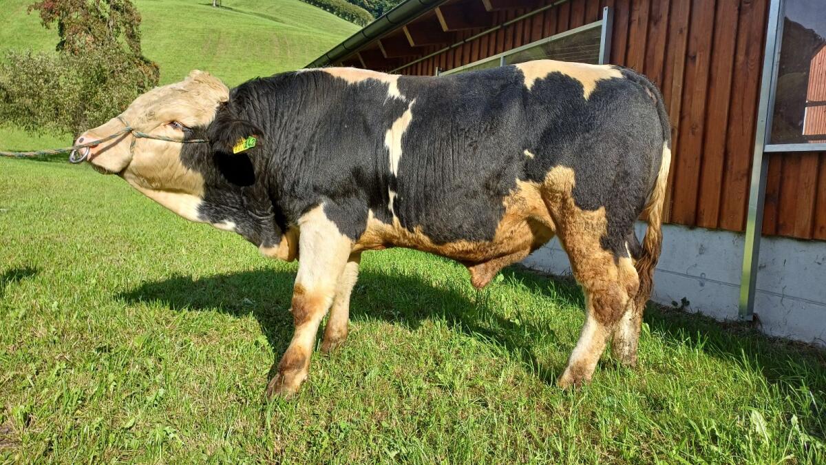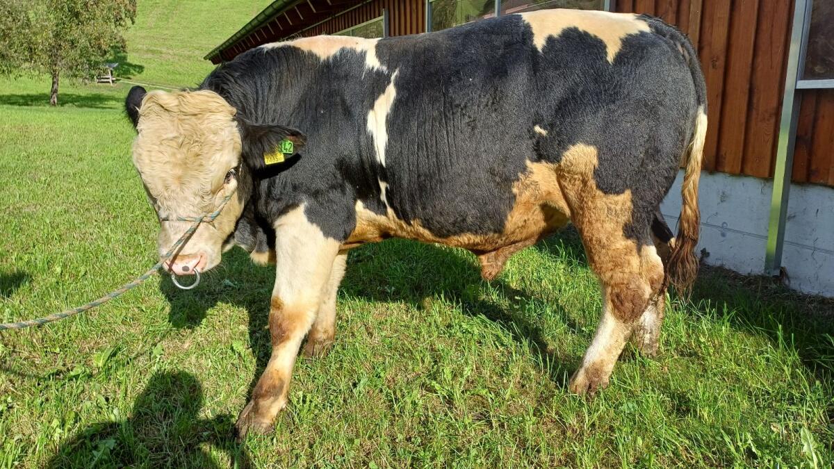 Junger Sprungstier FV x WBB, 528 kg, geboren am 28.9.2024. Laufstall und Anbindehaltung gewöhnt, ruhiger Charakter und führig. Nasenring, hat bereits gedeckt, Zustellung möglich! Preis auf Anfrage.