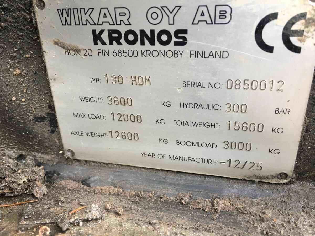 Wagen: Kronos 130 HDM, mit starkem Antrieb (BB6 Motoren auf vorderer Achse), Eigenölversorgung mit LS-Pumpe und Ölkühler, LED Beleuchtung, Rahmenauszug vorhanden, aber derzeit nicht montiert (derzeit kurzes Eigenbau-Heck montiert), Nokian Forstbereifung mit 1 Paar Ketten. Kran: Kronos 8020L mit 8,30 m Reichweite, Hultdins Supergrip Greifer, Danfoss Steuerung.