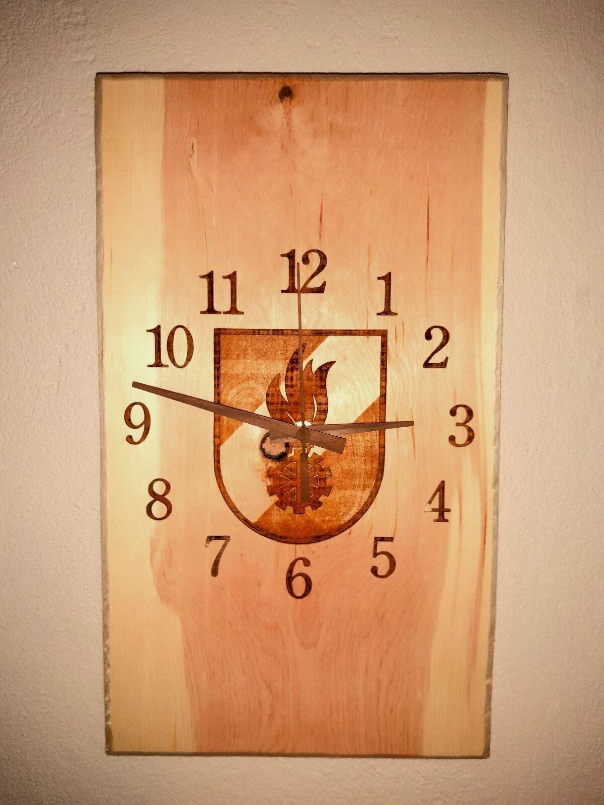 Küchenuhr, Wanduhr, Zimmeruhr aus Zirbenholz, mit gelasertem Feuerwehr-Logo, Zeichnung gelasert, Feuerwehruhr, Wohnzimmeruhr, Zirbenduft, Deko, Unikat, Holzuhr mit Holzeiger aus Nussholz, urig, rustikal, Geschenkidee.
