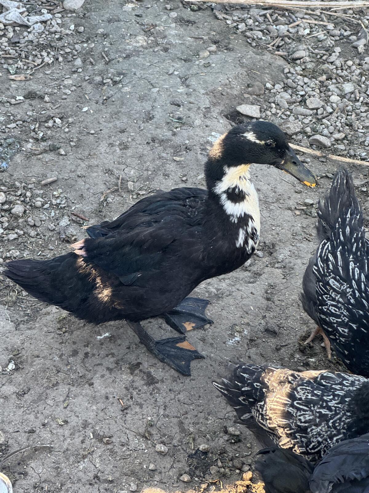 Laufentenbaby, 6 Wochen alt, abzugeben. Schwarz, weiß und schillerndes Grün im Gefieder.
