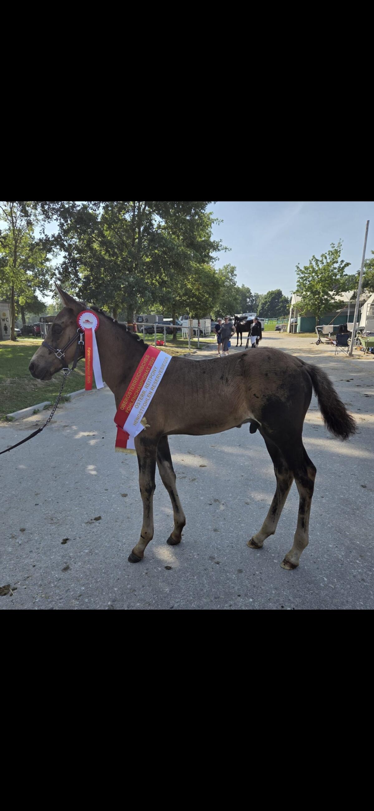 Reservesieger beim Fohlenchampionat und qualifiziert für Bundeschampionat. 06/2025 geboren mit der Farbe Buckskin (vom Labor bestätigt). Vater Don Papa WE / MV Mon Cherie F, doppeltveranlagt. Er wurde bereits 2x geimpft und beim Hufschmied vorgestellt. Platz vor Preis.