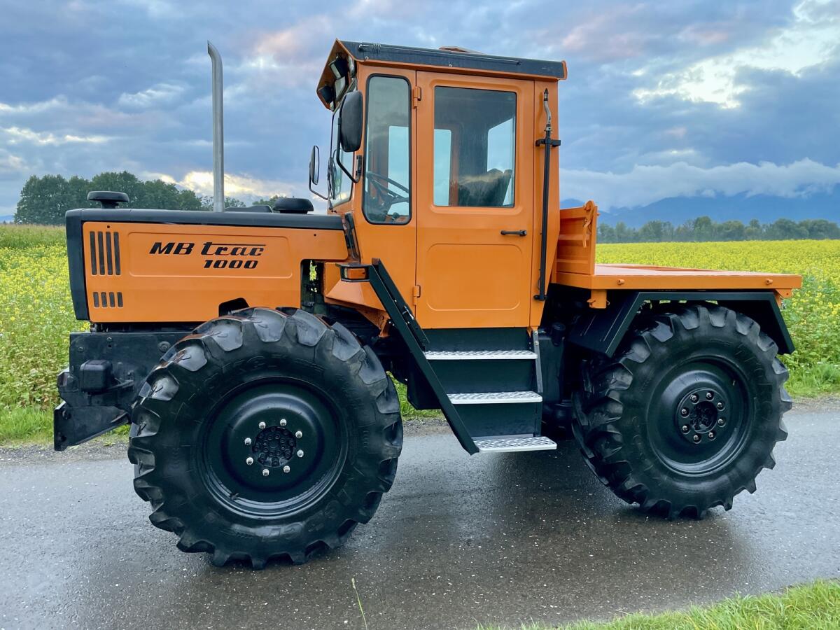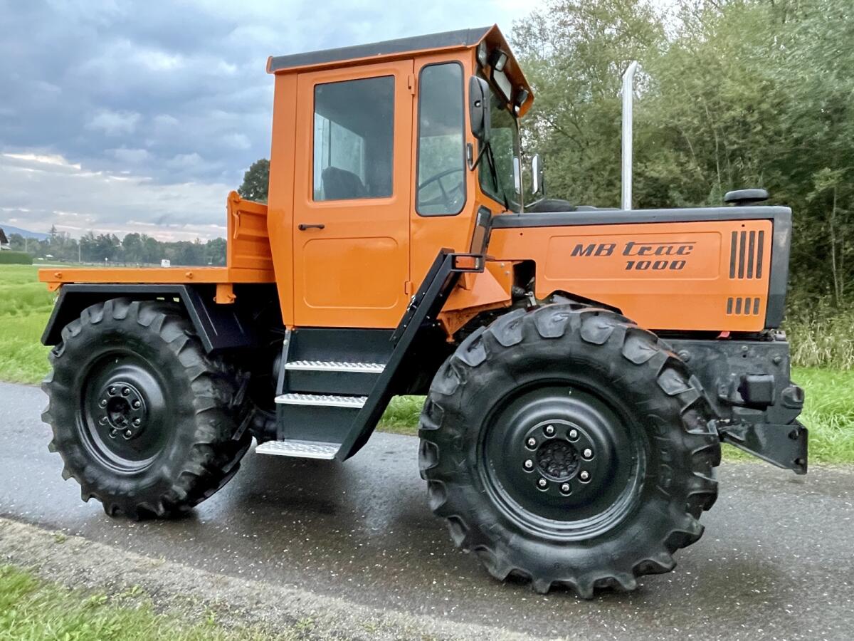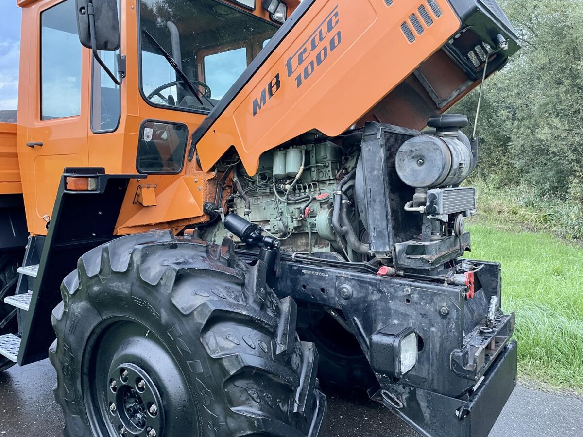 MB Trac 1000 - letzte Baureihe, EZ 1990, Bj. 12/1989 - gegen Gebot zu verkaufen. Sehr sauberer optischer und technischer Zustand! Kein Rost! 6 Zylinder, 6 l Hubraum OM366 Motor, schrägverzahntes Getriebe mit Kriechgängen, FZW und HZW 540 und 1.000, Trac läuft ruhig (nichts heult), Kleber 28 Zoll 100% Profil, 420/85R28, läuft 44km/h Serie, angemeldet, Zweitbesitz aus Sammlung, neues Pickerl, wenig Bstd. - lt. Zähler 8.954 h. Service komplett neu inkl. Filter. Fußmatte original die Erste. Lack Motorhaube, Seitenteile, Kabine, Rahmen, Motor und Getriebe original. Kotflügel vorne und hinten neu. Druckluft, 3 x dw, Trac trocken. Heckhubwerk nicht Serie (nachrüstbar). 3-Seitenkipper hinten + 2 x Bordwand. Bez. Murtal, Stmk.