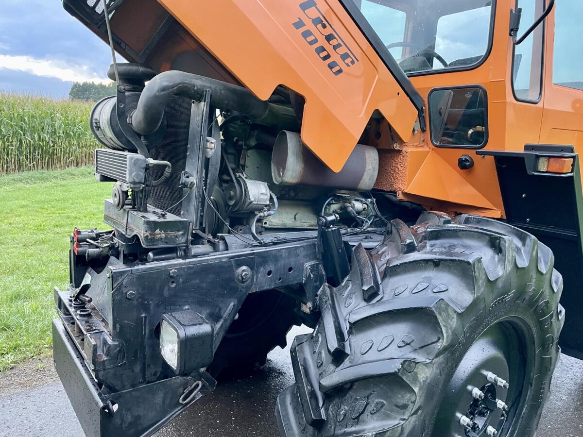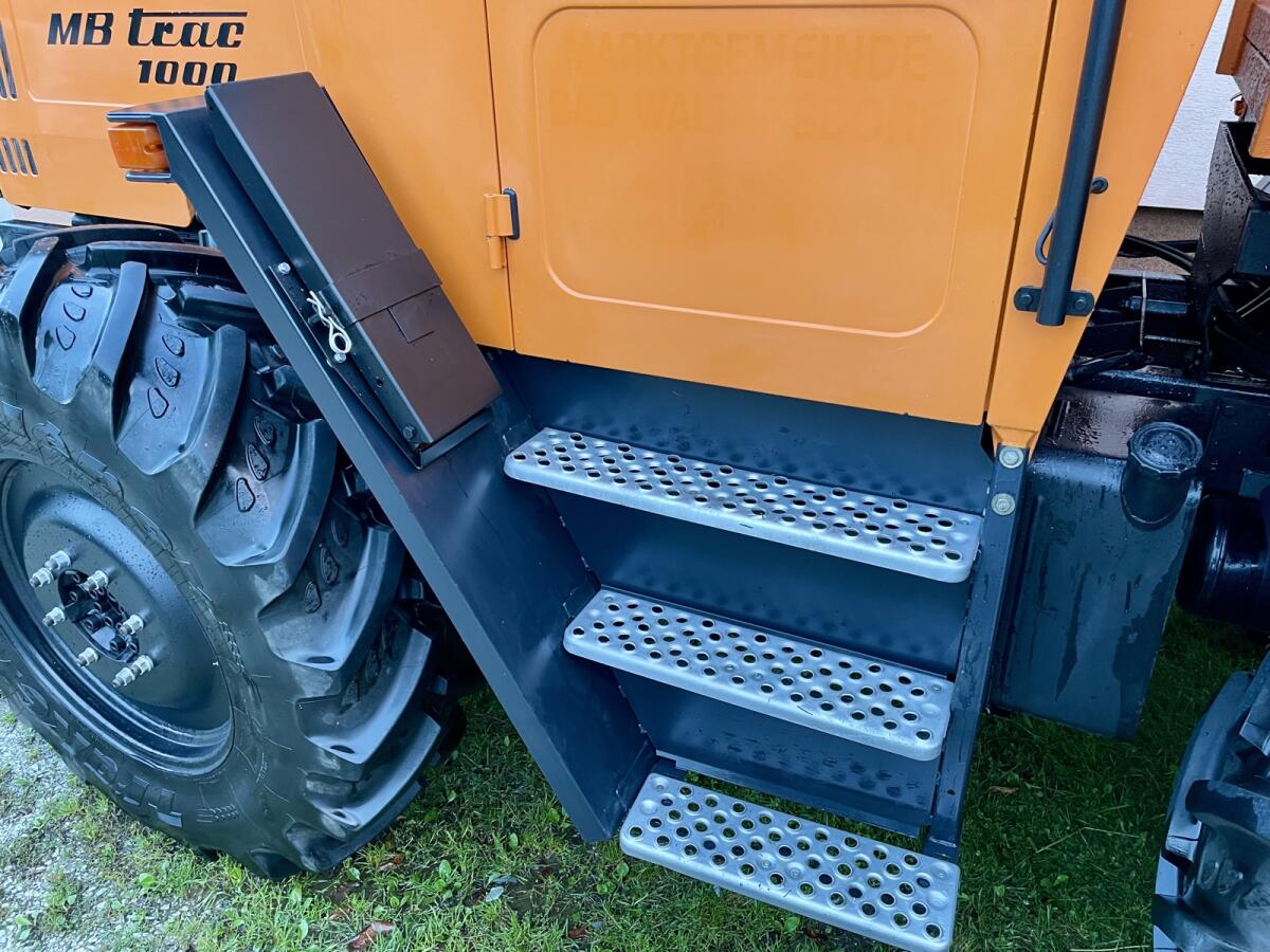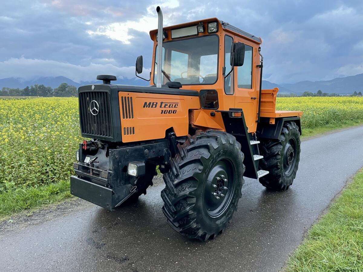 MB Trac 1000 - letzte Baureihe, EZ 1990, Bj. 12/1989 - gegen Gebot zu verkaufen. Sehr sauberer optischer und technischer Zustand! Kein Rost! 6 Zylinder, 6 l Hubraum OM366 Motor, schrägverzahntes Getriebe mit Kriechgängen, FZW und HZW 540 und 1.000, Trac läuft ruhig (nichts heult), Kleber 28 Zoll 100% Profil, 420/85R28, läuft 44km/h Serie, angemeldet, Zweitbesitz aus Sammlung, neues Pickerl, wenig Bstd. - lt. Zähler 8.954 h. Service komplett neu inkl. Filter. Fußmatte original die Erste. Lack Motorhaube, Seitenteile, Kabine, Rahmen, Motor und Getriebe original. Kotflügel vorne und hinten neu. Druckluft, 3 x dw, Trac trocken. Heckhubwerk nicht Serie (nachrüstbar). 3-Seitenkipper hinten + 2 x Bordwand. Bez. Murtal, Stmk.
