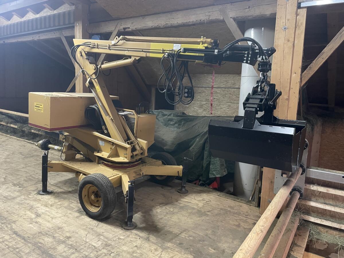 Riener Kran, BF-4N mit aufgebautem Rotator, Schoppeinrichtung und Mistschaufel, angetrieben über Zapfwelle oder E-Motor, 3 Ballastgewichte in Beton können einzeln herausgehoben werden