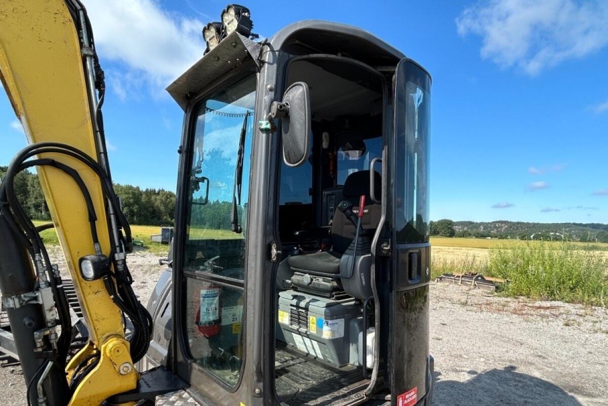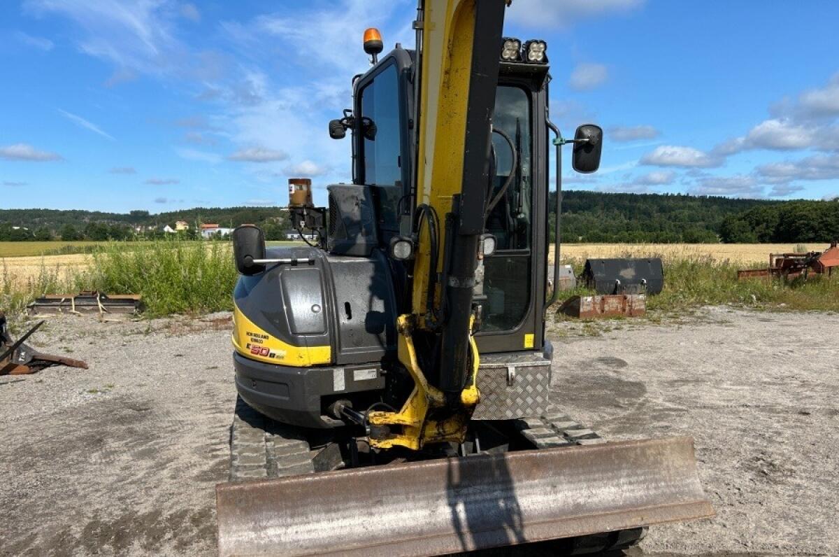 Bagger New Holland E50B SR, Bj. 2012, 3.504 h, 31,5 kW, Diesel, Armbandtyp: Gummi, 4.945 kg, Planungseimer, schmale Schaufel, Gabeln, Griff, Eimer wegwerfen.