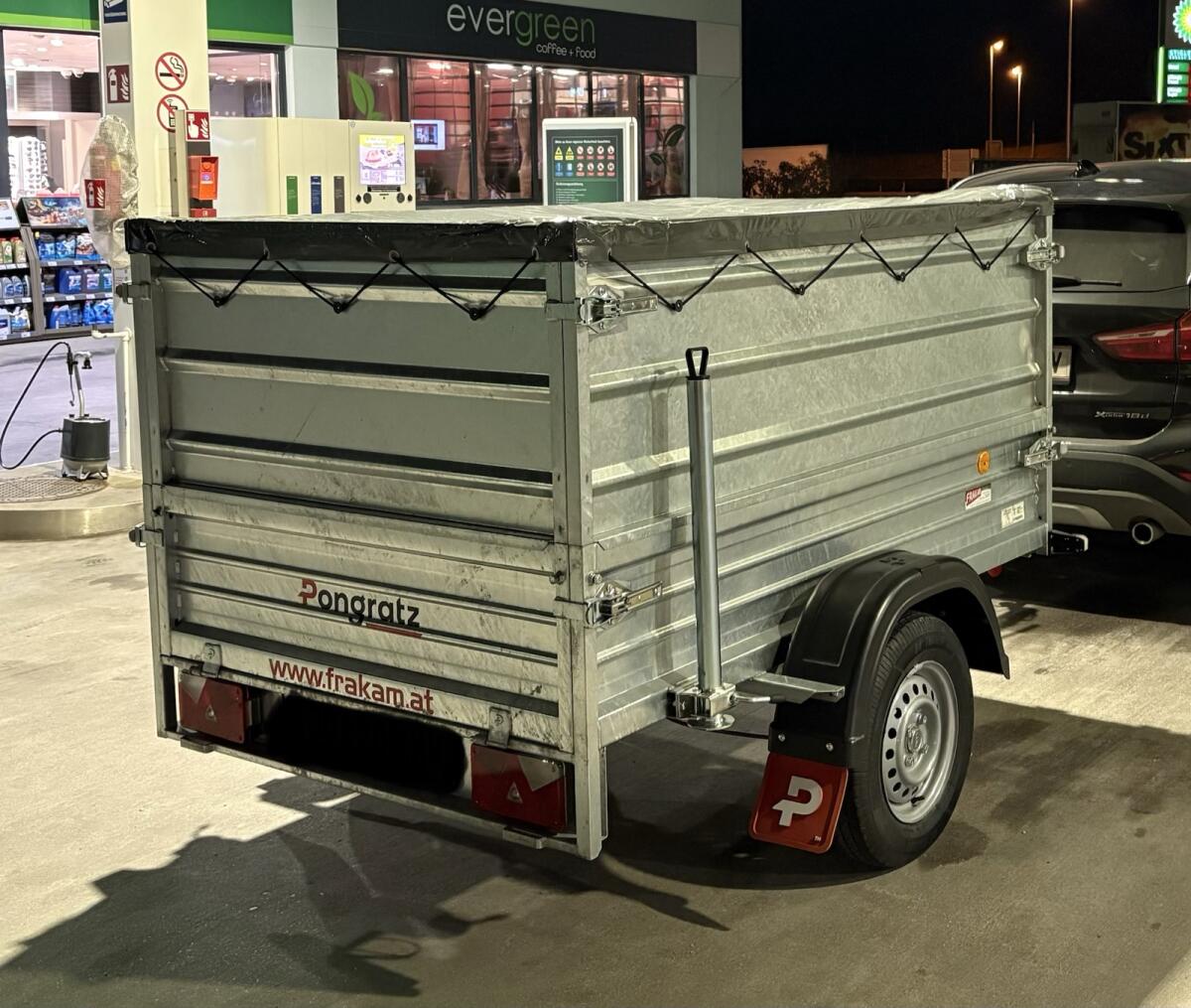 Neuwertiger PKW-Anhänger (EZ 02/2025) der Marke Pongratz, Modell EPA 206/12 G-STK SET (einachsig, auflaufgebremst, HzGG 1.000 kg, Stirnwand klappbar), mit 600 mm Aufsatzwänden und Abstellstützen sowie Flachplane in neuwertigem Zustand (nur wenige Hundert km gelaufen) abzugeben.