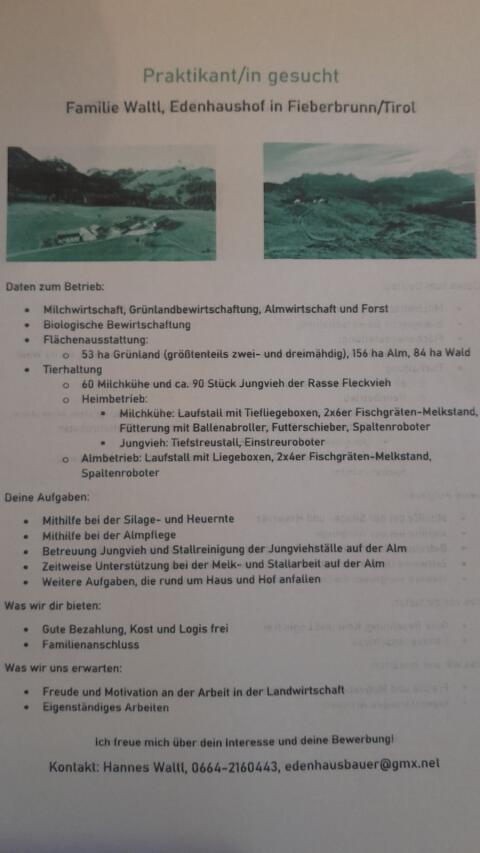 Wir bieten wieder einen Praxisplatz für die Monate April bis Juli an! Auf unserem Biobauernhof im Mostviertel halten wir ca. 50 Bio-Milchkühe mit Melkroboter und 450 Bio-Mastschweine. Wir bewirtschaften ca. 90 ha Acker, Wiese, Wald und haben einen modernen Fuhrpark. Wir haben die letzten Jahre gute Erfahrungen mit Kärntner Praktikanten gemacht, da diese das Praktikum im Frühsommer ausüben können. Bei Interesse melde dich persönlich bei uns.