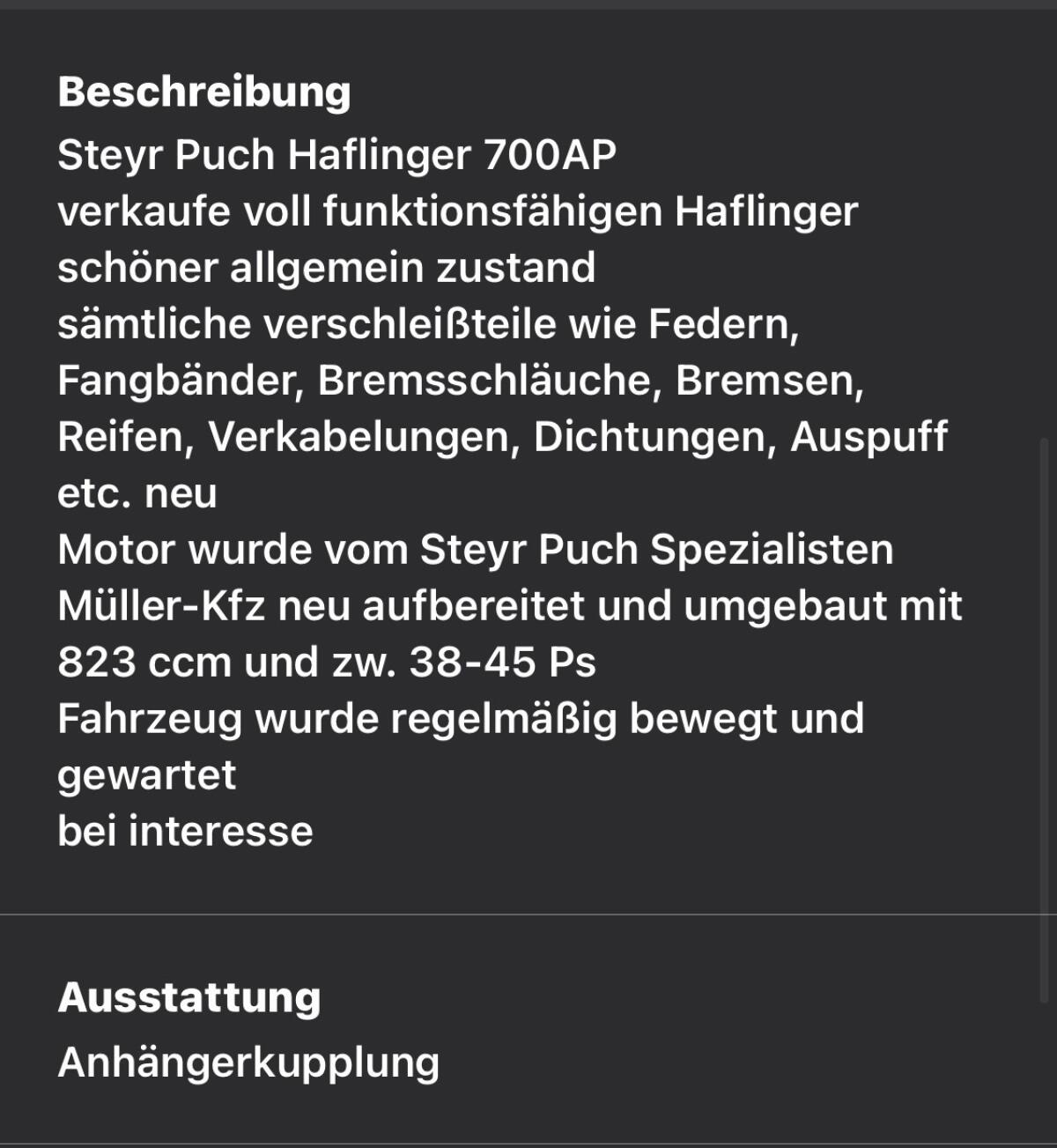 Steyr Puch Haflinger 700AP, verkaufe voll funktionsfähigen Haflinger, schöner allgemeiner Zustand, sämtliche Verschleißteile wie Federn, Fangbänder, Bremsschläuche, Bremsen, Reifen, Verkabelungen, Dichtungen, Auspuff etc. neu. Motor wurde vom Steyr Puch Spezialisten Müller-Kfz neu aufgebaut und umgebaut mit 823 ccm und zw. 38-45 PS. Fahrzeug wurde regelmäßig bewegt und gewartet, bei Interesse bitte melden.
