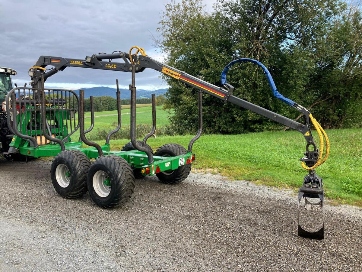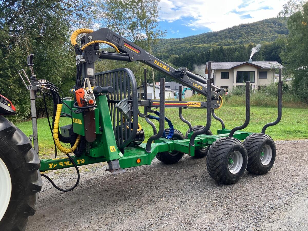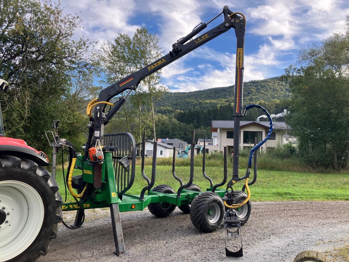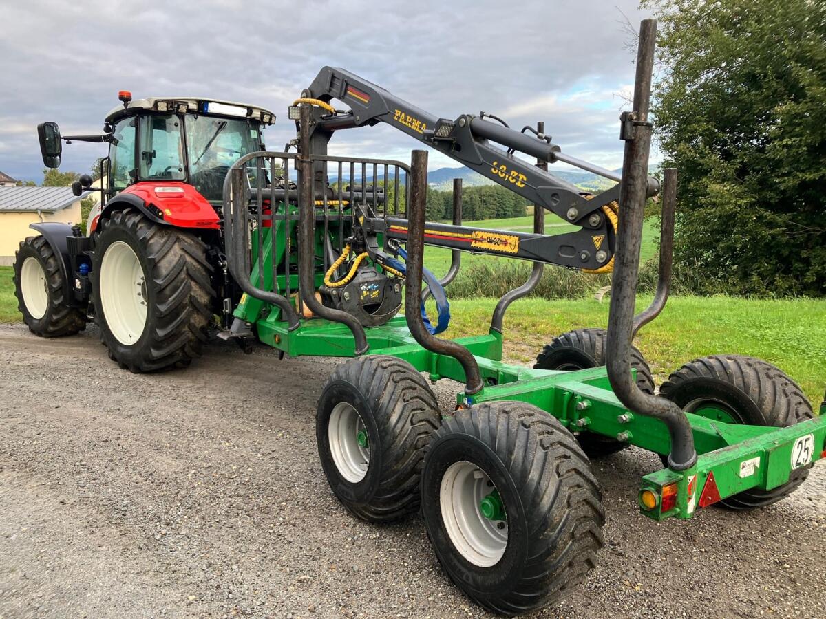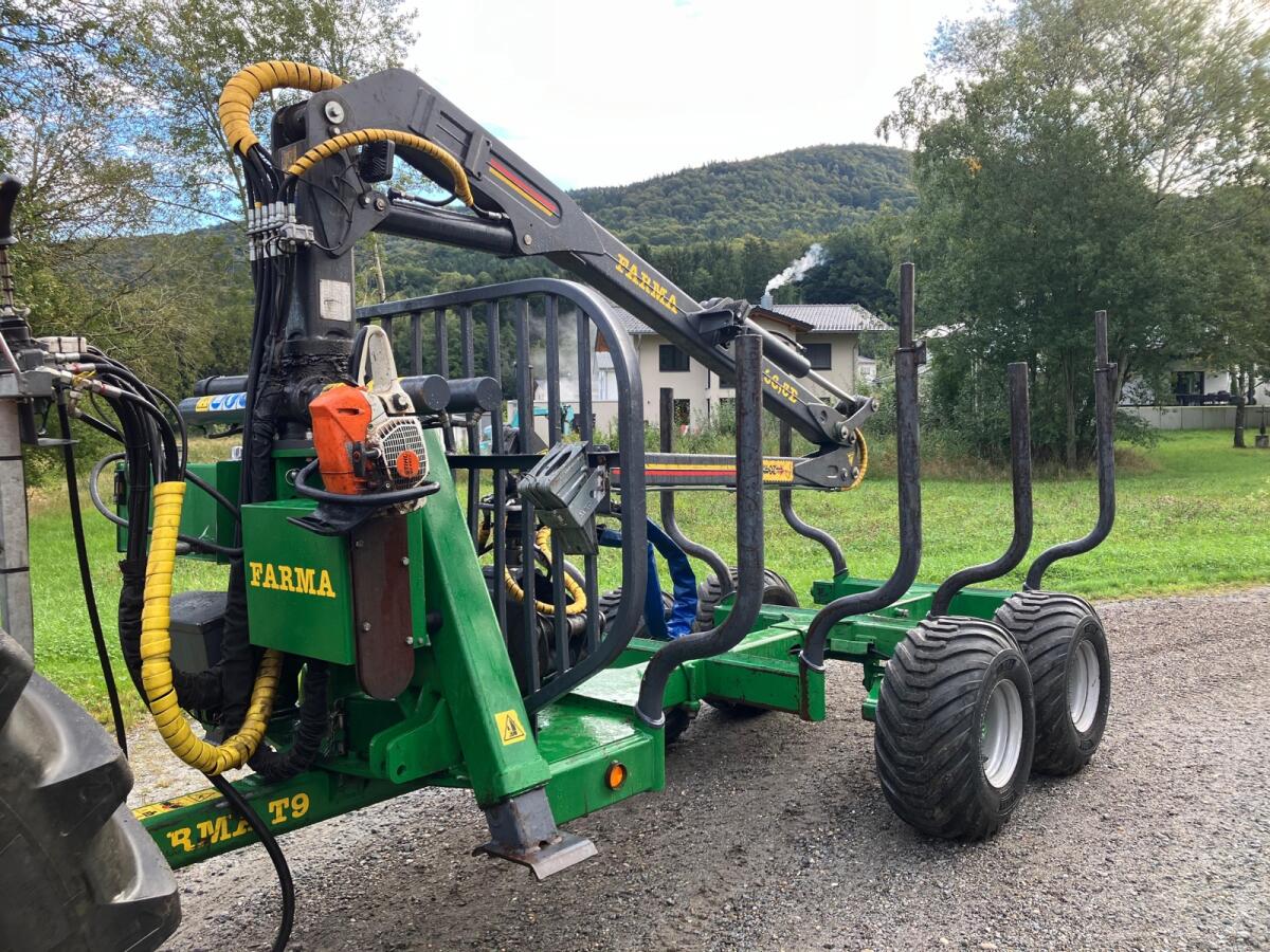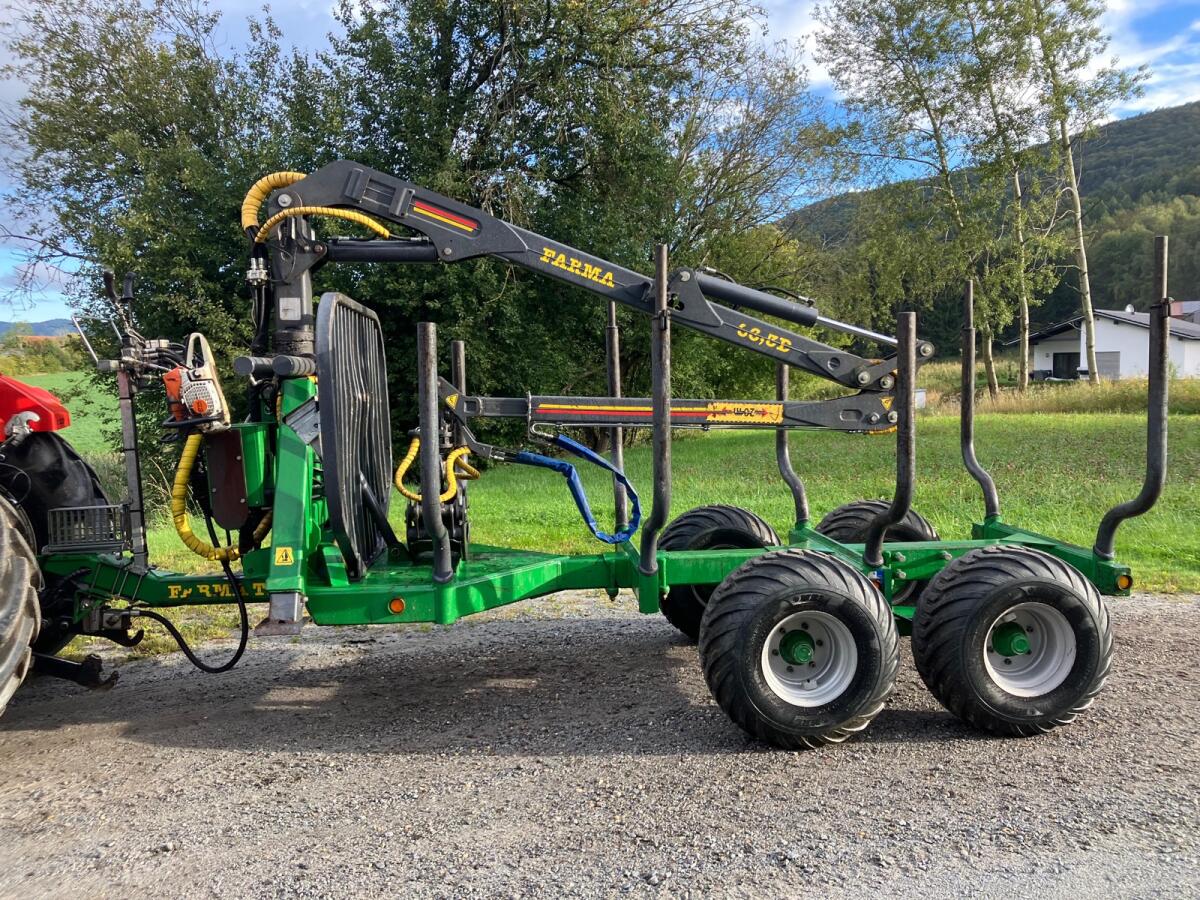 Rückewagen Farma CT6,3-9, zul. Gesamtgewicht 9 t, 4x neue Forstreifen 400/60-15.5, Eigenölversorgung, Kranreichweite 6,3 m, 4x Rungenverlängerung, 2-Achsen hydraulisch gebremst, 2x LED-Scheinwerfer an Kransäule, 1x LED-Scheinwerfer am Ausleger, Werkzeugkiste abnehmbar, Motorsägenhalterung, Rücklichter in Schweißkonsolen geschützt.