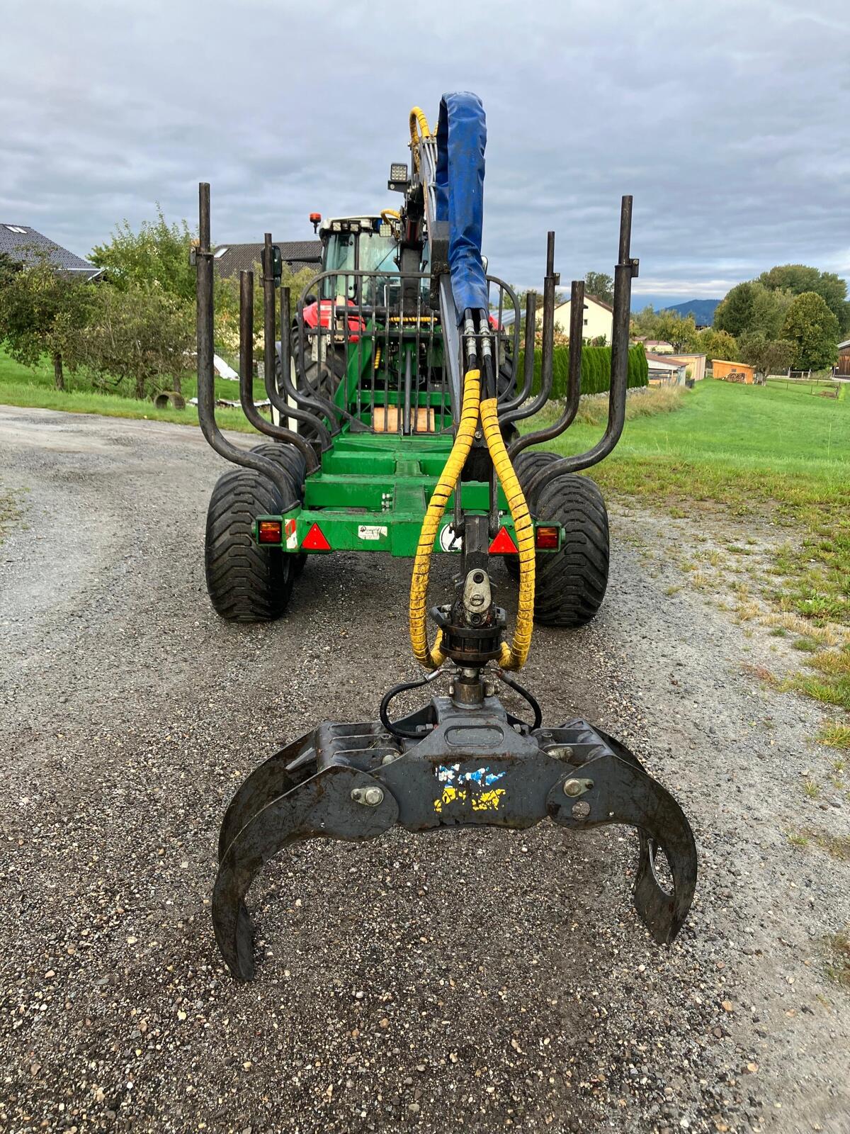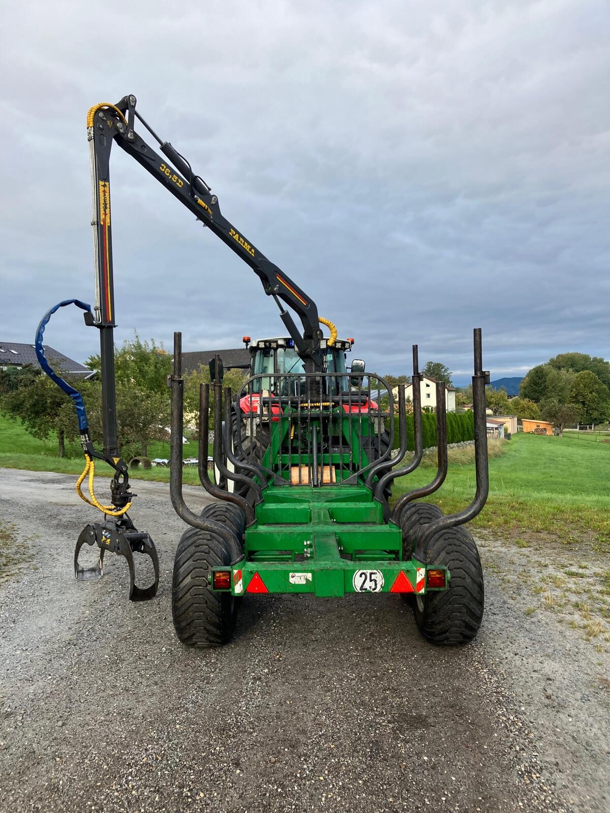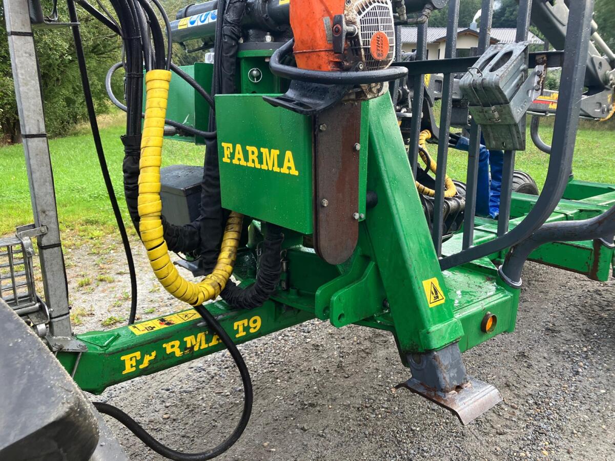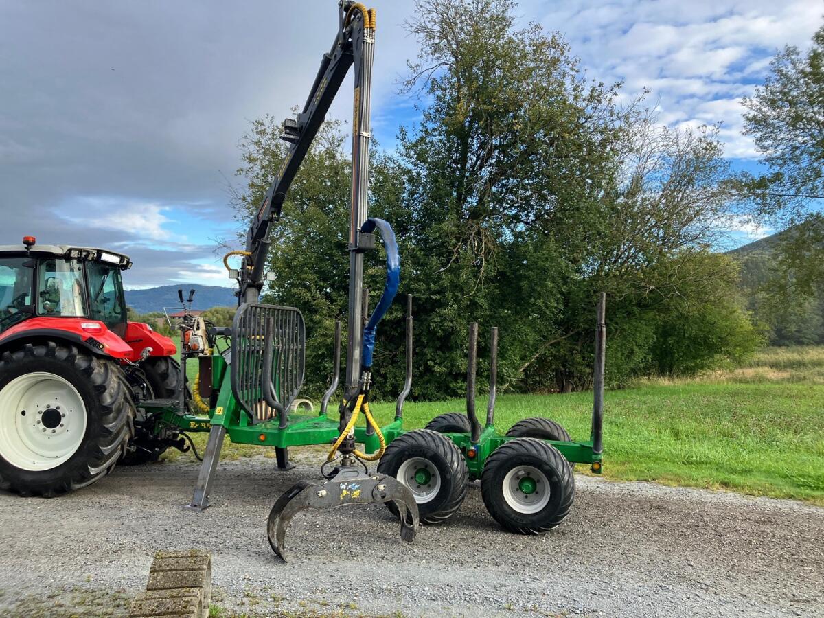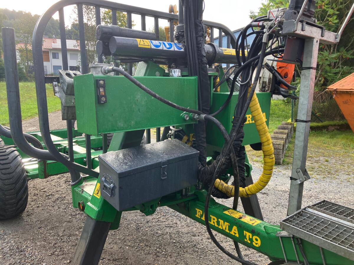 Rückewagen Farma CT6,3-9, zul. Gesamtgewicht 9 t, 4x neue Forstreifen 400/60-15.5, Eigenölversorgung, Kranreichweite 6,3 m, 4x Rungenverlängerung, 2-Achsen hydraulisch gebremst, 2x LED-Scheinwerfer an Kransäule, 1x LED-Scheinwerfer am Ausleger, Werkzeugkiste abnehmbar, Motorsägenhalterung, Rücklichter in Schweißkonsolen geschützt.