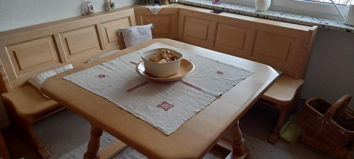 Massive helle Bauerneckbank mit Tisch und Stuhl. Eckbank 190x190 cm, Tisch 110x110 cm. Vom Schreiner angefertigt. Gut erhalten.
